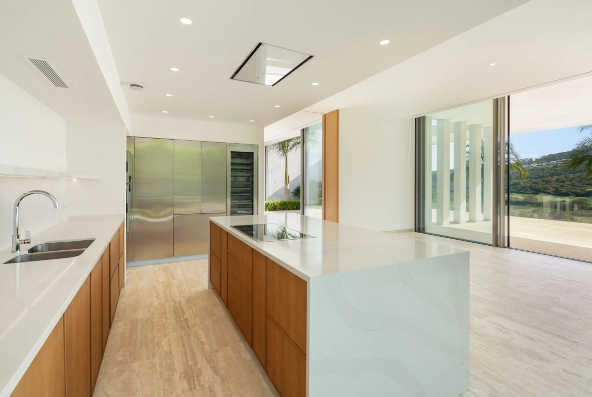 La cuisine se fond sans effort avec l’extérieur, grâce à de grandes fenêtres coulissantes en verre qui brouillent les frontières entre la vie intérieure et extérieure. Une caractéristique notable de cette propriété est la capacité de toutes les fenêtres à s’ouvrir complètement, invitant l’extérieur à l’intérieur, un élément qui la distingue.