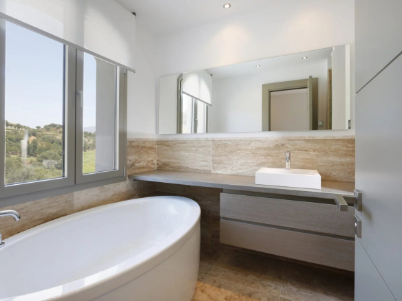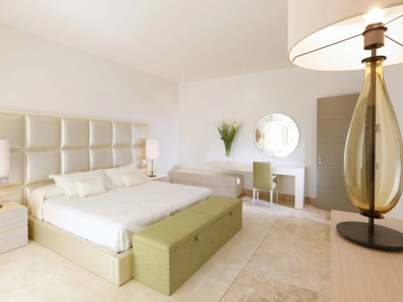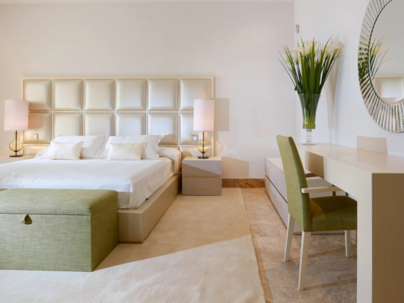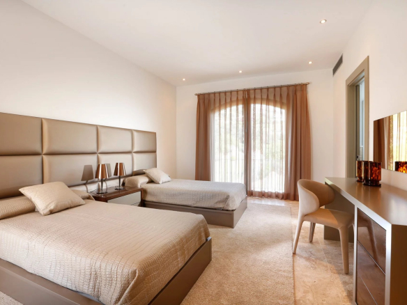 A l’étage supérieur se trouve la chambre principale avec dressing, une grande salle de bain privée et une terrasse. Encore une fois, cette terrasse offre une vue magnifique sur le golf et la mer. Deux autres chambres d’hôtes se trouvent également à ce niveau. L’un est à l’avant avec les mêmes vues incroyables, des armoires encastrées et également une salle de bain privée.