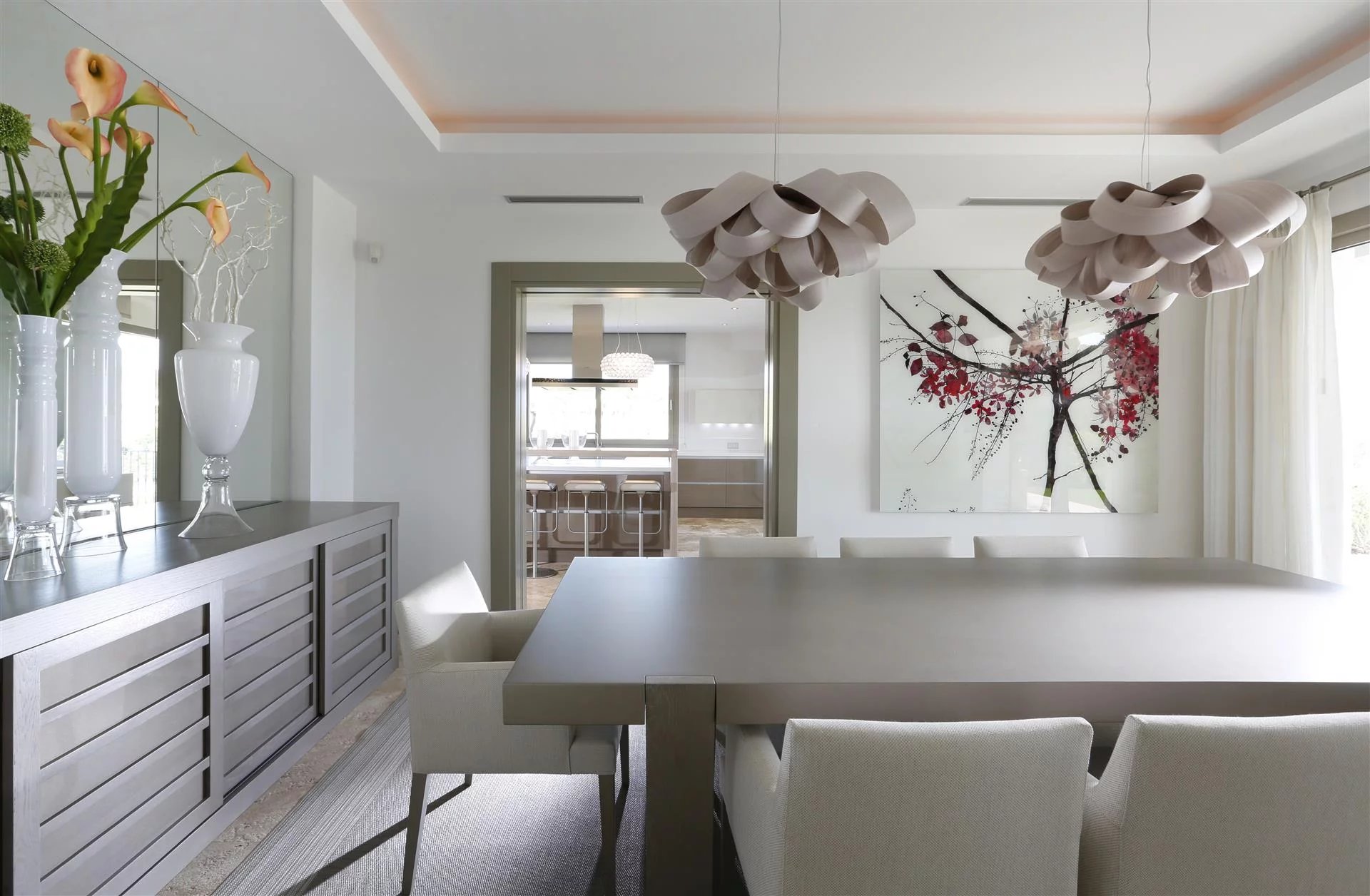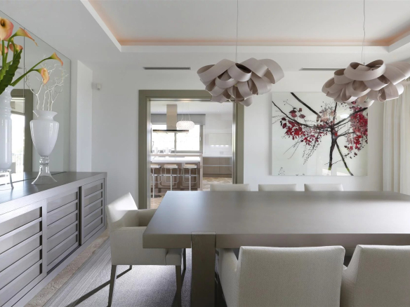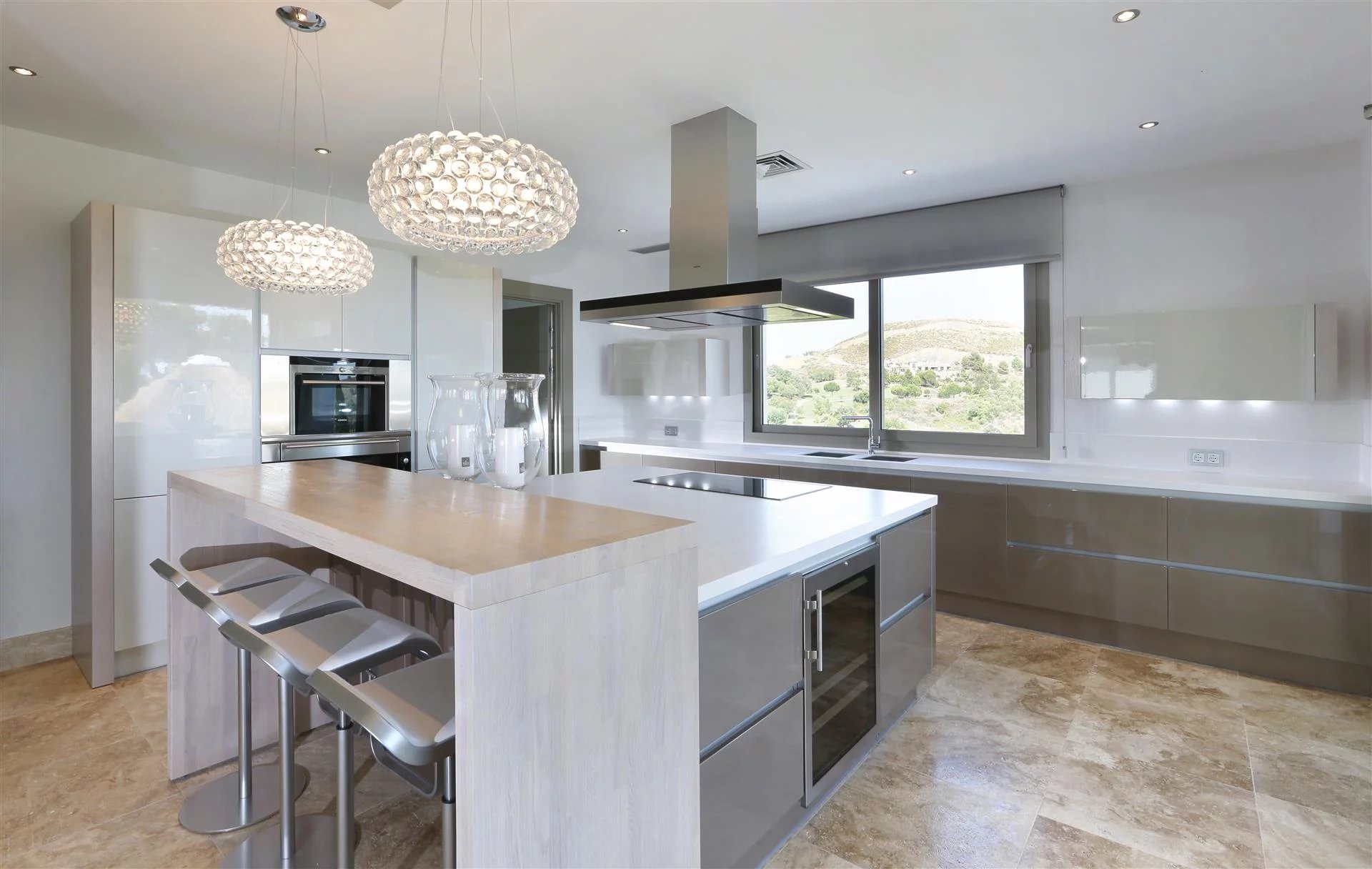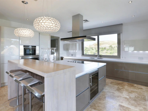 La cuisine moderne entièrement équipée avec buanderie séparée dispose d’un bar pour le petit-déjeuner et offre une vue sur le golf et la mer. Des portes-fenêtres donnent accès à la terrasse couverte avec coin repas pour 6 personnes.