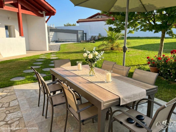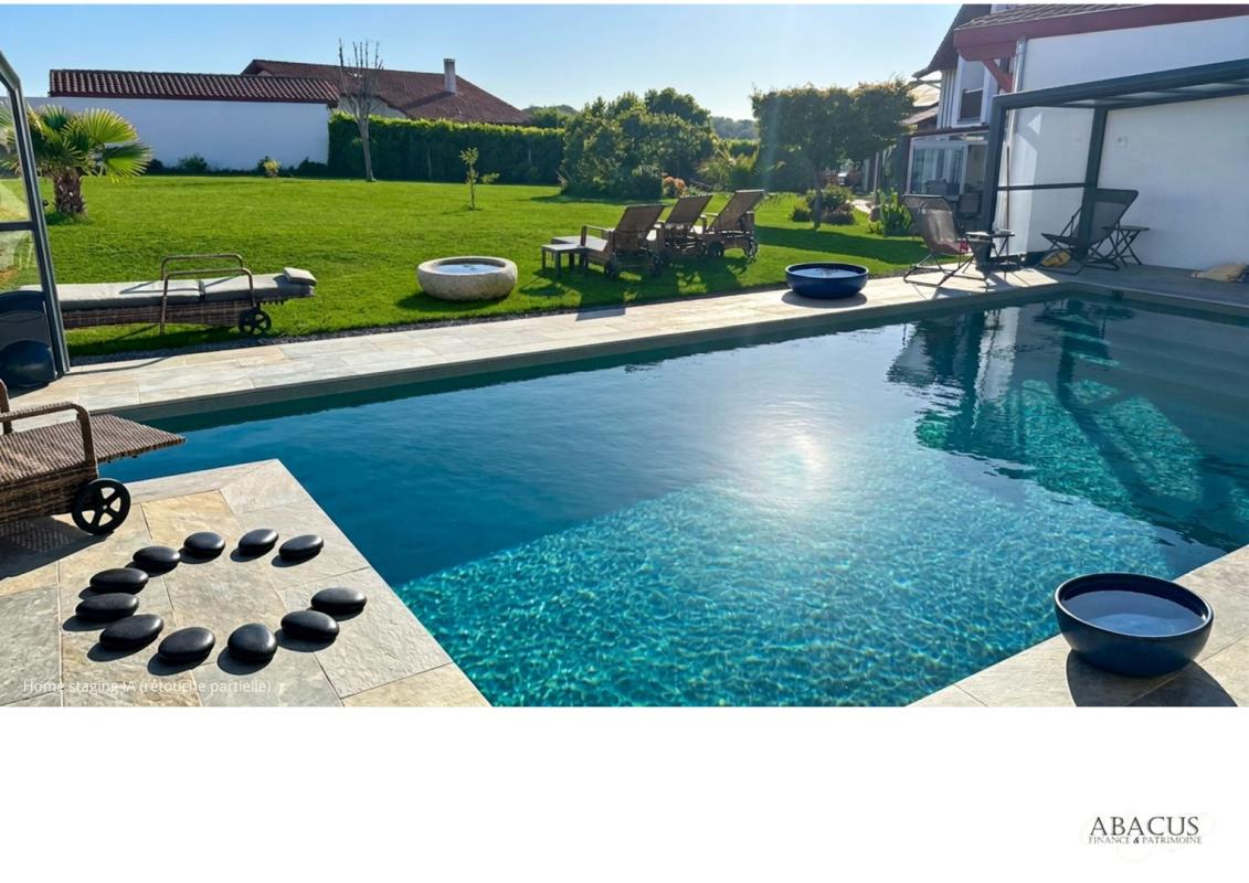 La piscine miroir avec abri motorisé offre une utilisation à l’année, dans un cadre paysagé de 2 000 m² entièrement plat ? une rareté absolue dans ce secteur prisé du Pays Basque.