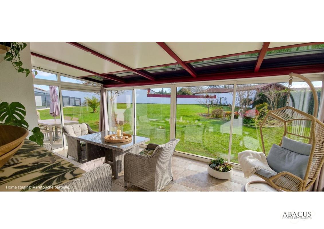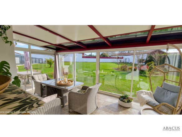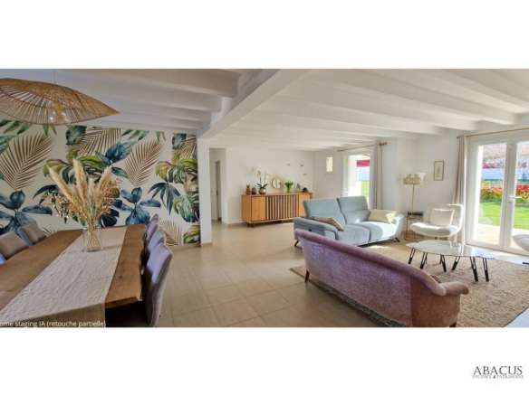 La véranda de 21 m² ouverte sur le jardin et la cuisine indépendante haut de gamme complètent un espace de vie généreux et pensé pour le quotidien comme pour la réception.