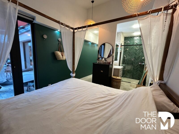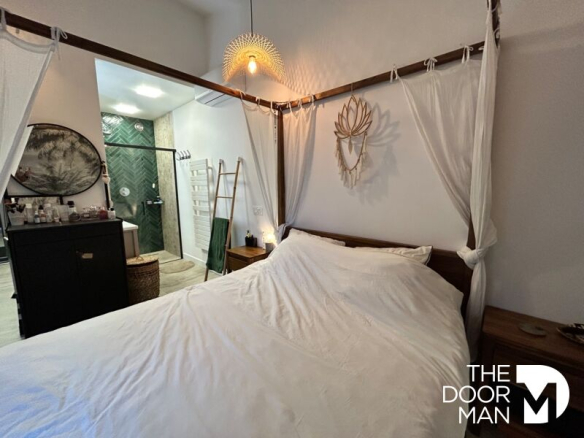Le rez-de-chaussée se compose d’un séjour avec cuisine ouverte aménagée et équipée, bénéficiant de beaux matériaux, et de très belles finitions, le tout avec un accent exotique inspiré des paysages de Bali. Une suite parentale se situe également de plain-pied, ainsi que des toilettes indépendantes.