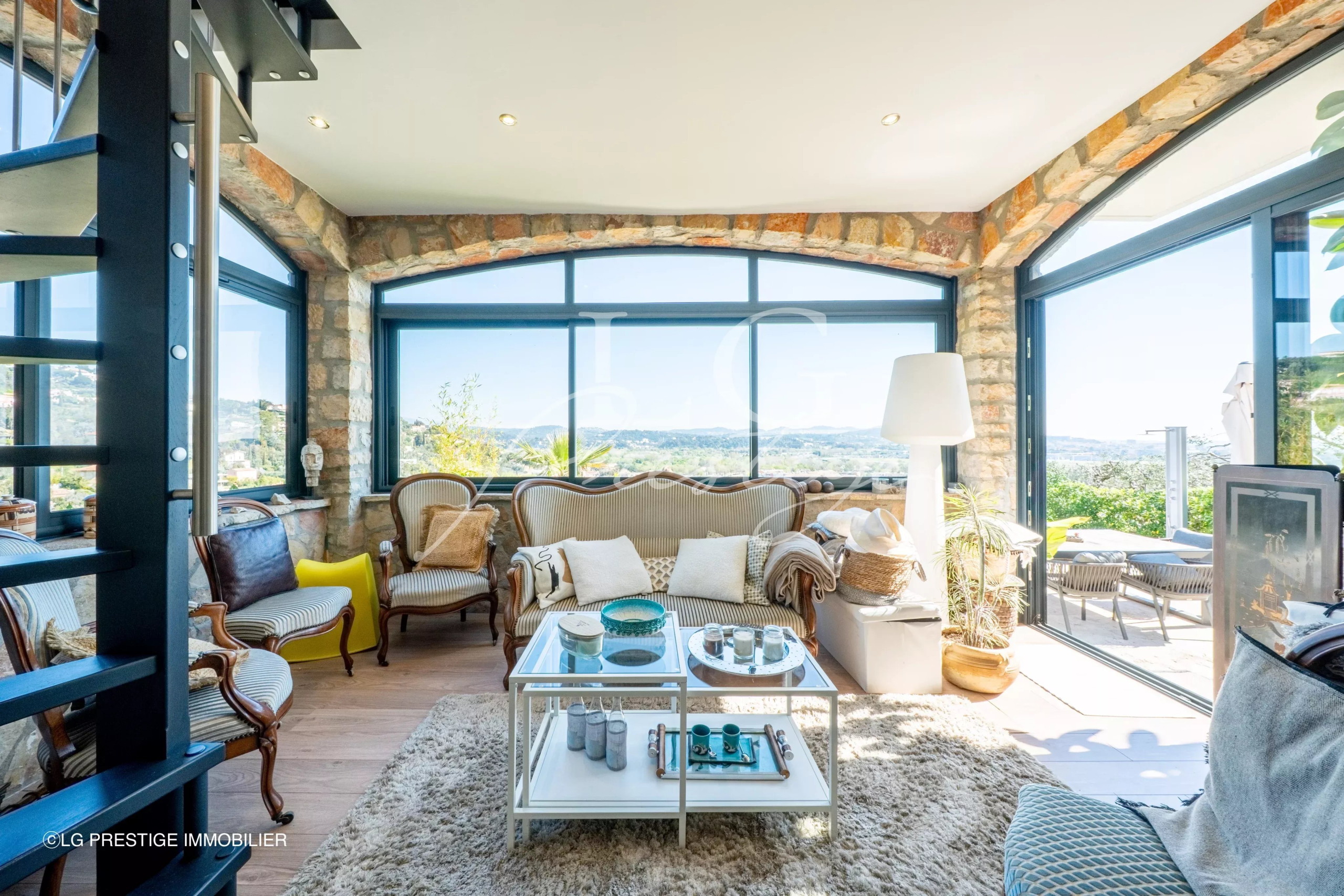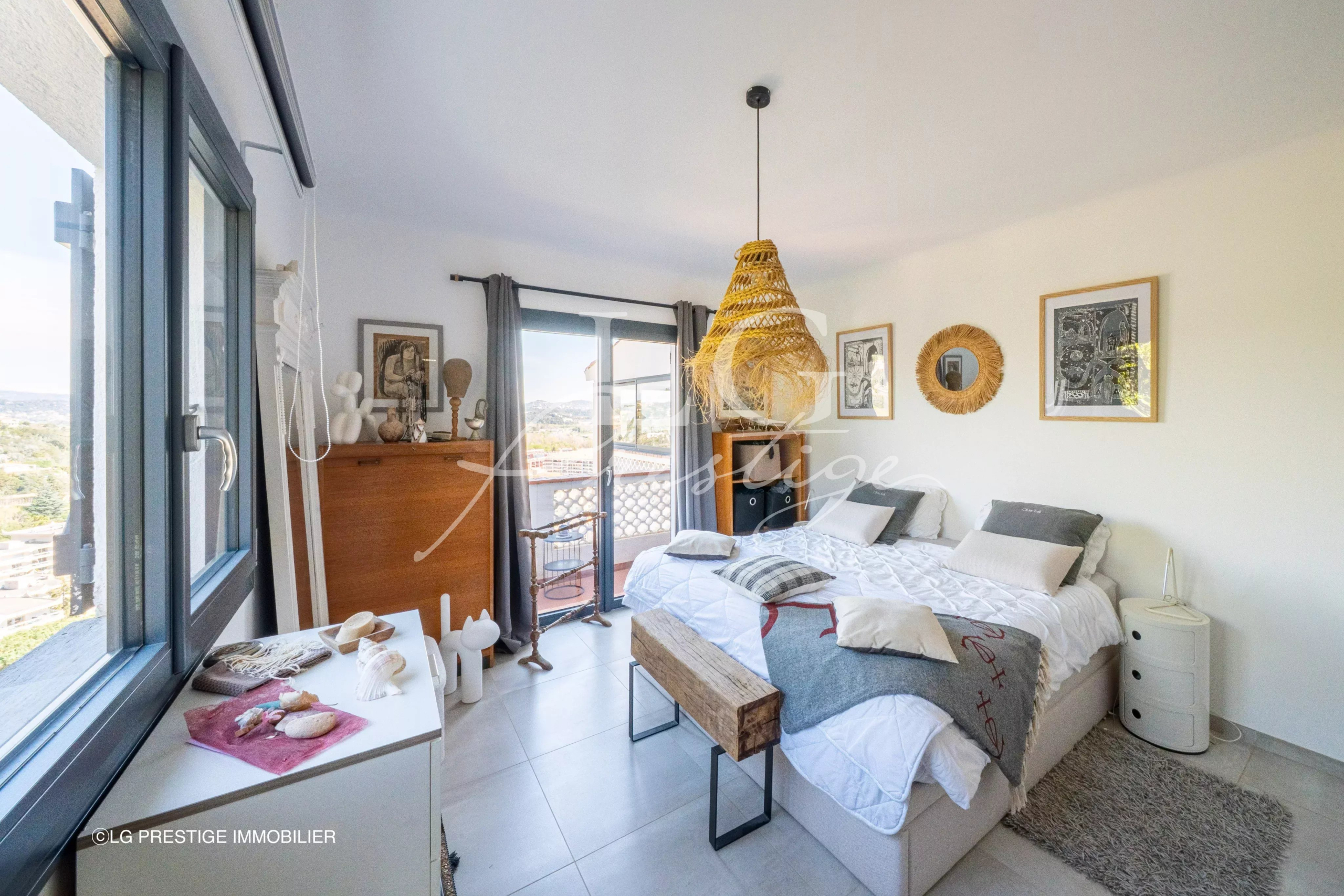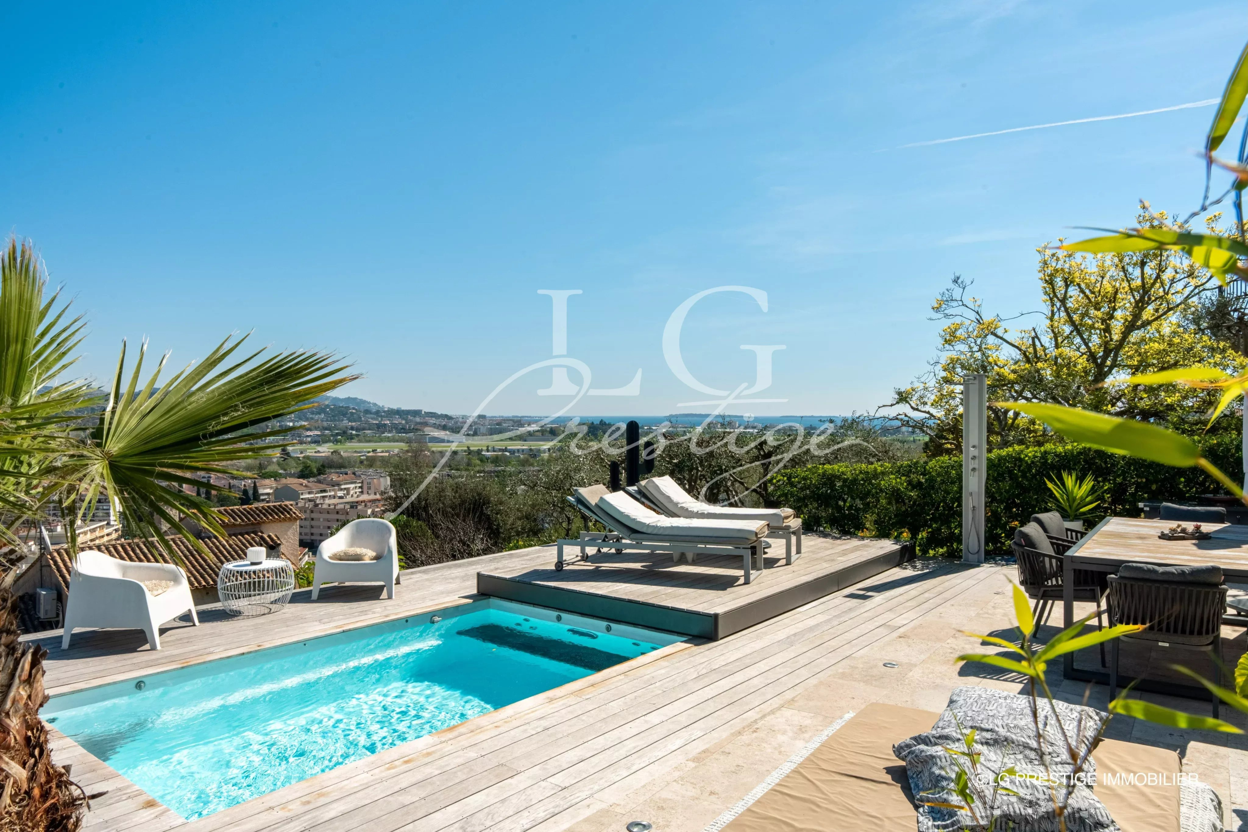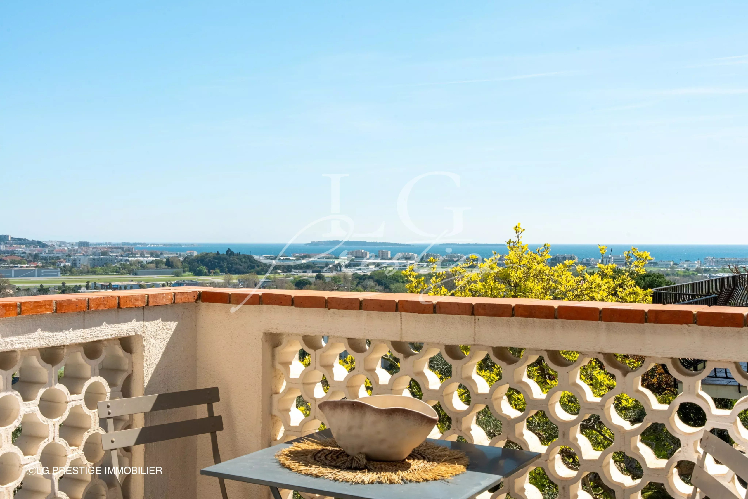 Belle maison de 175 m² entièrement rénovée, offrant une superbe vue dégagée sur la mer, les îles de Lérins, les collines et les montagnes, idéalement située à 5 minutes à pied des commerces, dans un quartier calme et prisé sur les hauteurs du centre-ville.