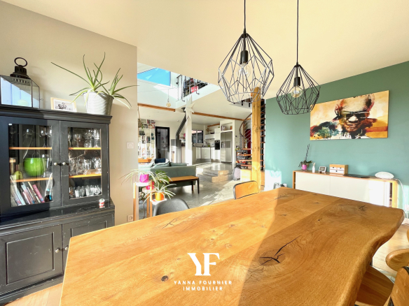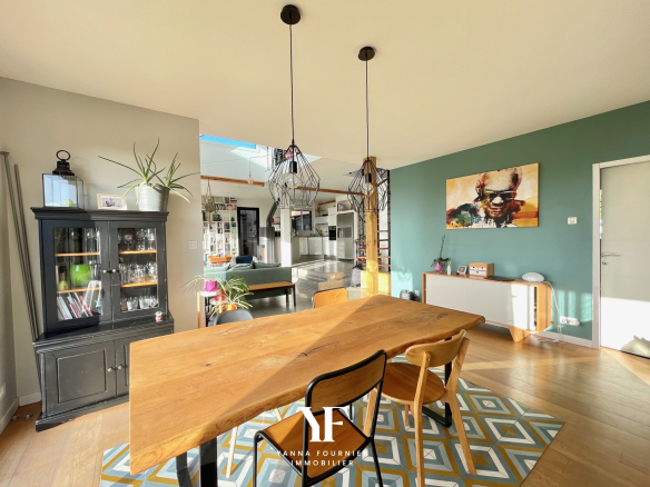 Implantée dans un environnement naturel privilégié à Rosnoën, Sur la route des plages de la presqu’île de Crozon, cette maison d’architecte présentée par Yanna Fournier, s’étend sur 220 m2 habitables au coeur d’un terrain paysager d’environ 3 000 m2. En position dominante, elle bénéficie d’une vue dégagée et panoramique sur la vallée, les plaines environnantes et la rivière de l’Aulne, dans un cadre paisible et sans vis-à-vis. Son architecture élégante et affirmée associe ossature bois, zinc et volumes horizontaux, pour une ligne résolument contemporaine. Les extérieurs, pensés comme un prolongement naturel de la maison, s’organisent autour de plusieurs terrasses en bois, d’un patio intimiste et d’un jardin ouvert sur un paysage préservé. Le rez-de-chaussée accueille de généreux espaces de vie baignés de lumière. Le salon-séjour, largement ouvert sur l’extérieur par de vastes baies vitrées cadrant le panorama, se prolonge par un espace détente dédié à toute la famille. La cuisine ouverte, conviviale et fonctionnelle, s’intègre harmonieusement à l’ensemble. Les matériaux choisis, béton ciré, bois et verrières esprit atelier, soulignent un goût du détail. Ce niveau propose quatre chambres de plain-pied. Un espace enfants dédié comprend trois chambres, une salle de bains et une salle de jeux, tandis qu’une chambre indépendante dispose de sa propre salle de bains privative. Le patio, accessible depuis les pièces de vie et l’une des chambres, offre un espace extérieur protégé, propice aux moments de détente à l’abri des regards et des vents. À l’étage, une mezzanine ouverte et lumineuse dessert une suite parentale indépendante avec chambre, dressing, salle d’eau et accès direct à une terrasse panoramique offrant une vision privilégiée du paysage. À proximité immédiate, chemins de promenade et accès à la rivière invitent à un art de vivre tourné vers la nature, avec la possibilité de pratiquer des activités nautiques. Rare par son architecture, sa vue et la qualité de ses volumes, cette propriété se prête aussi bien à une résidence principale qu’à une résidence secondaire. A mi chemin entre Brest et Quimper, A 5 mn du Faou et de de la rade de Brest et 15 mn des plages le la baie de Douarnenez et 30 mn de Lanvéoc. Ecole primaire et bus scolaire à proximité.