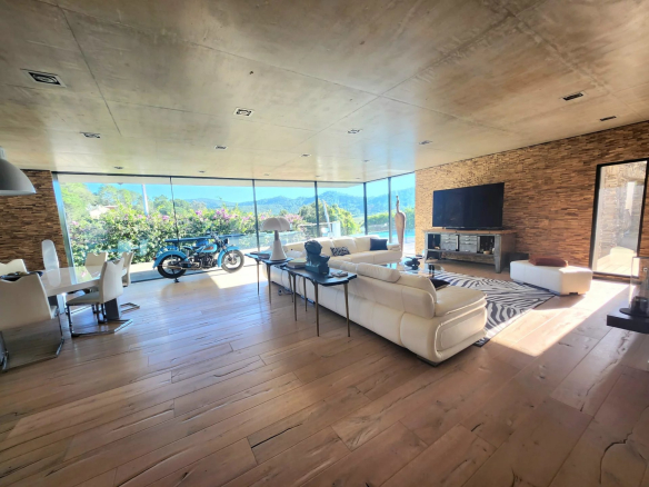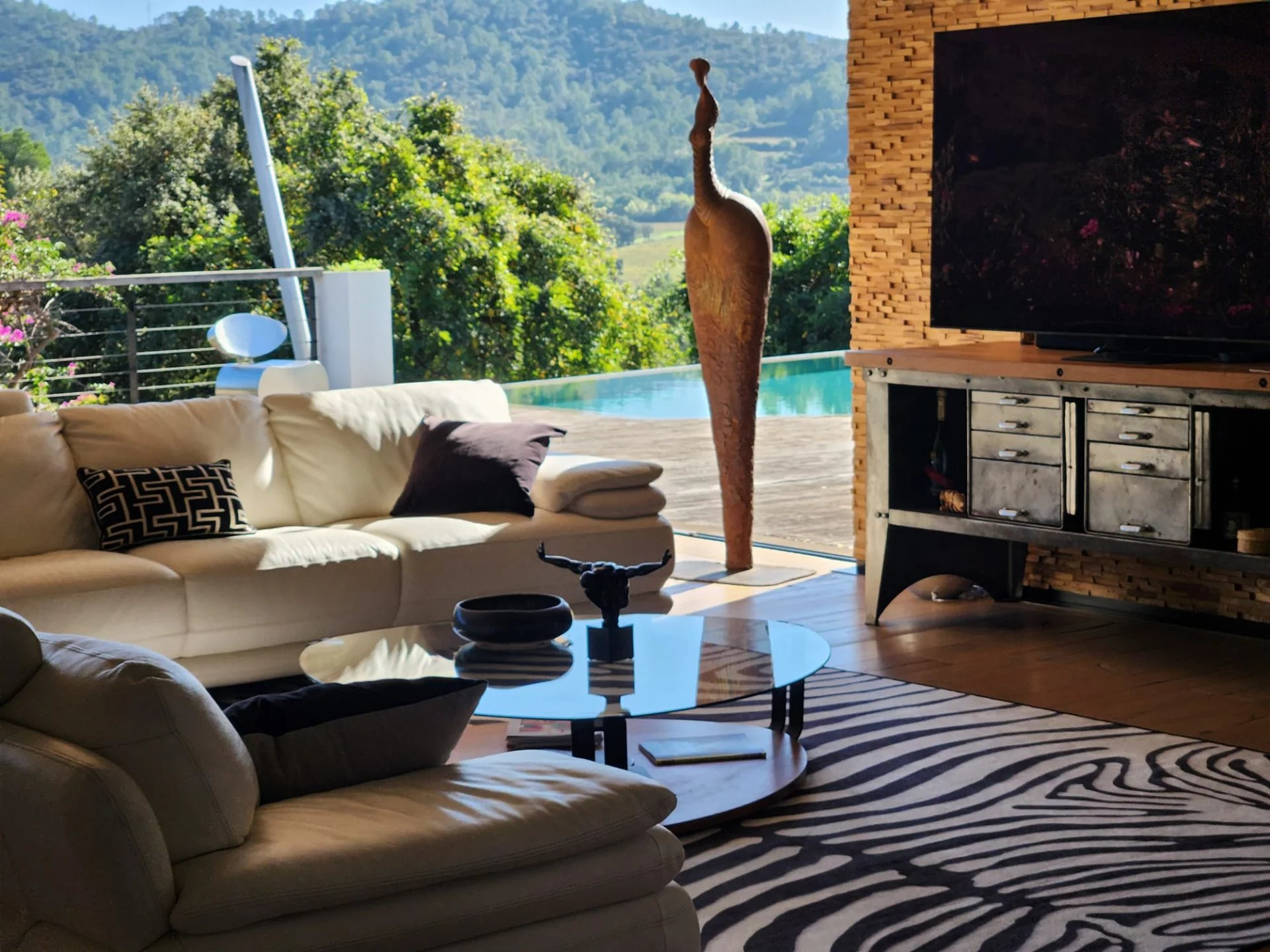 L’espace de vie principal de 115 m2 impressionne par sa lumière et ses volumes : baies vitrées entièrement rétractables, ouverture totale sur l’extérieur, et une vue panoramique sur la piscine à débordement et les collines environnantes.