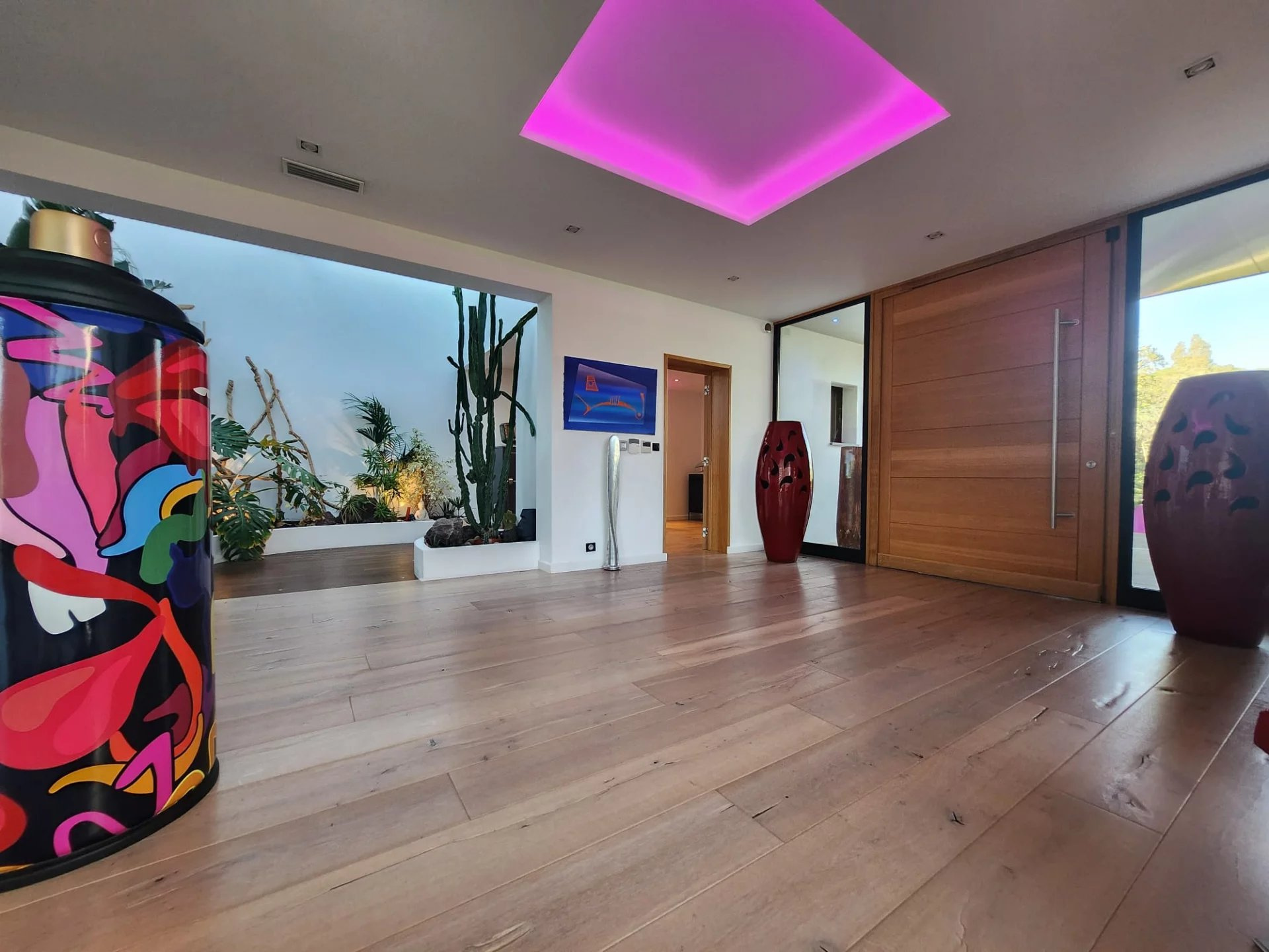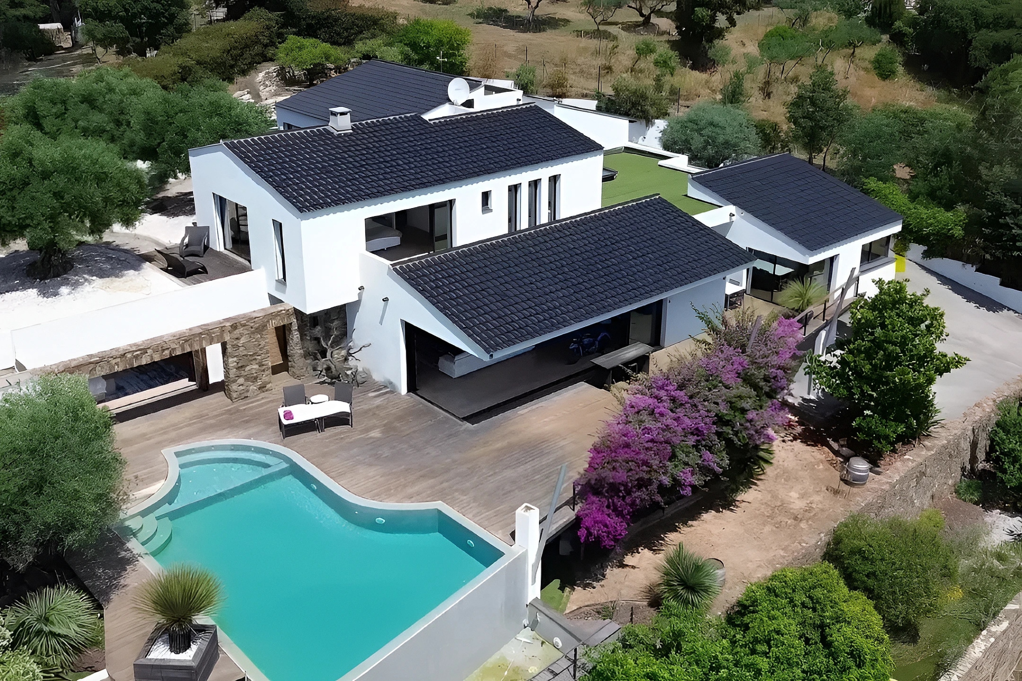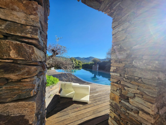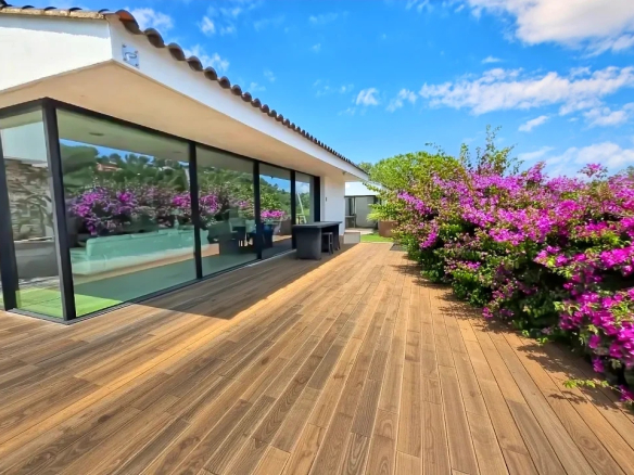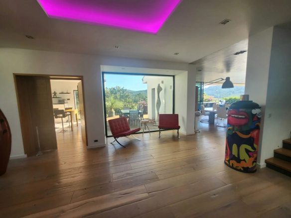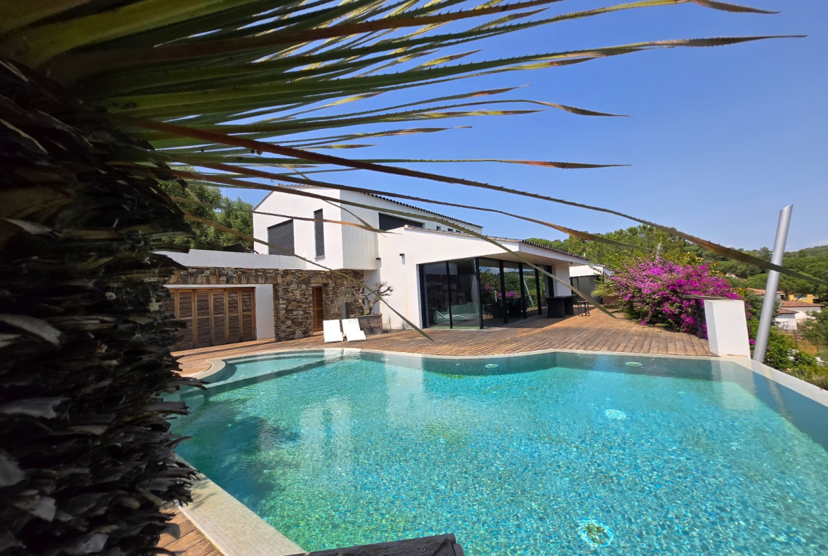 Très rare à la vente, cette propriété unique séduira les amateurs de design, de nature et de confort absolu. Nichée dans un écrin de verdure, entre bougainvilliers, magnolias, oliviers et autres essences méditerranéennes, cette villa contemporaine de 2011 trône en position dominante face à la majestueuse chaîne du Massif des Maures.