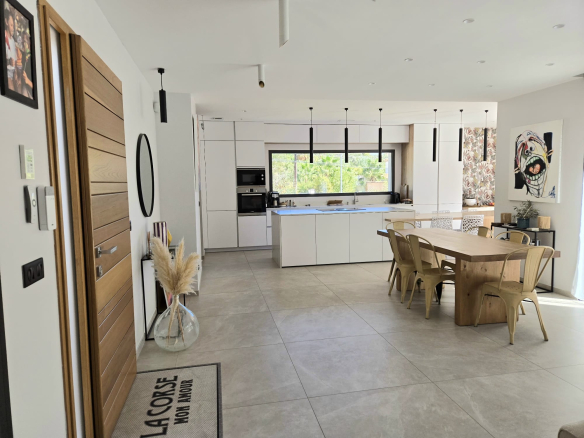 En rez-de-chaussée vous découvrirez : – Pièce à vivre de 63 m2 avec sa cuisine contemporaine entièrement équipée, alliant matériaux nobles et confort. Elle se poursuit de la salle à manger et du salon, le tout baigné de lumière s’ouvre sur la terrasse et la piscine.