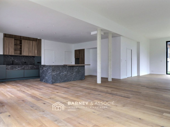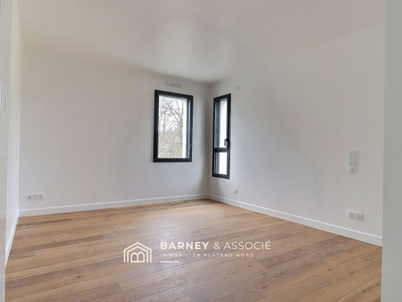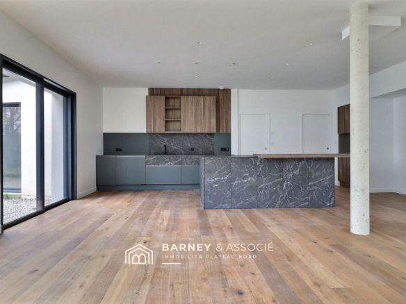 Cette maison contemporaine de 238 m² construite en 2025 est réalisée avec des matériaux de qualité, huisserie alu noir, parquet chêne, cuisine haut de gamme.