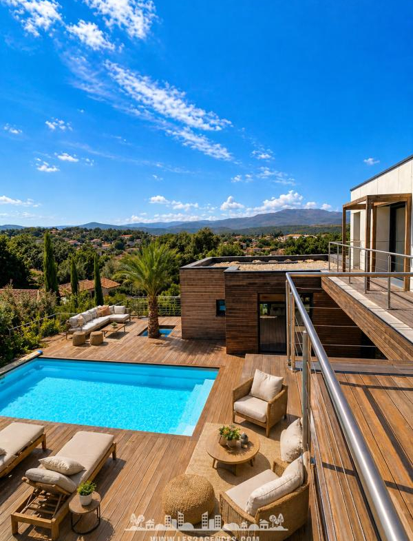 À l’extérieur : vaste terrasse en bois entourant une piscine au sel, idéale pour vos moments de détente.