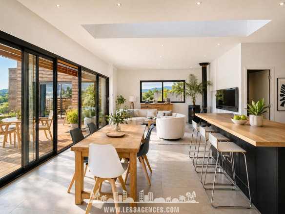 Lumineuse grâce à ses grandes baies vitrées, ambiance chaleureuse et ouverte