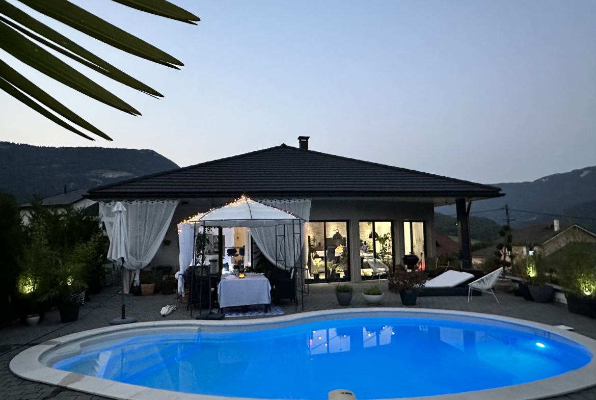 Y’HÔTES TRANSACTION vous propose en exclusivité un bien rare à la vente sur le secteur de Champfromier (01410), 33 km du canton de Genève entrée par Chancy et proche des stations du Jura. Cette grande maison d’architecte totalisant 310m2 (8 pièces dont 5 chambres) saura vous séduire par ses espaces très bien pensés, le tout sur une parcelle de 2330m2 entièrement arborées avec piscine chauffée avec vue dégagée sur les montagnes.