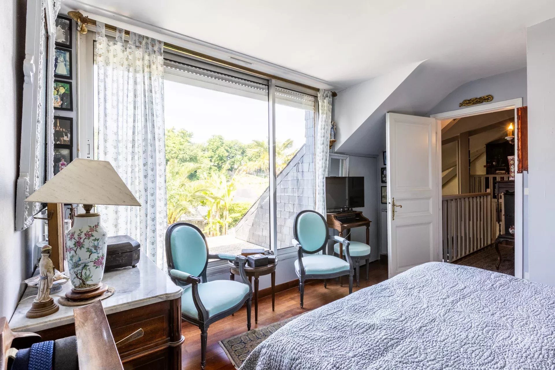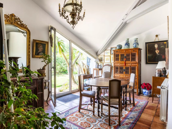 L’œuvre du dessinateur a fonctionné car dès l’entrée le charme opère. Le séjour et le salon offrent des volumes atypiques et déplafonnés et s’orientent vers un magnifique jardin enchanteur aux essences variées et aux végétaux exotiques qui bordent une piscine chauffée.