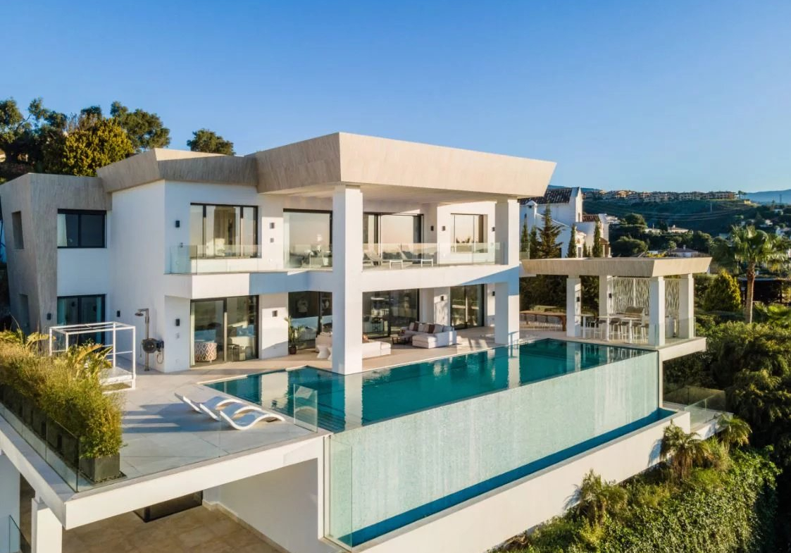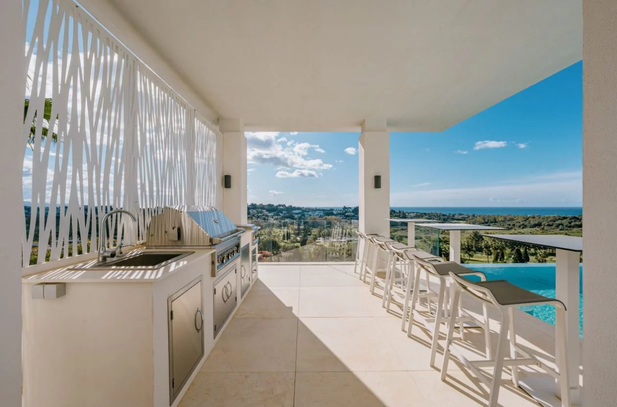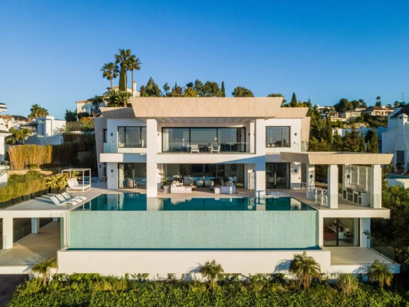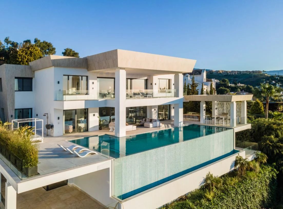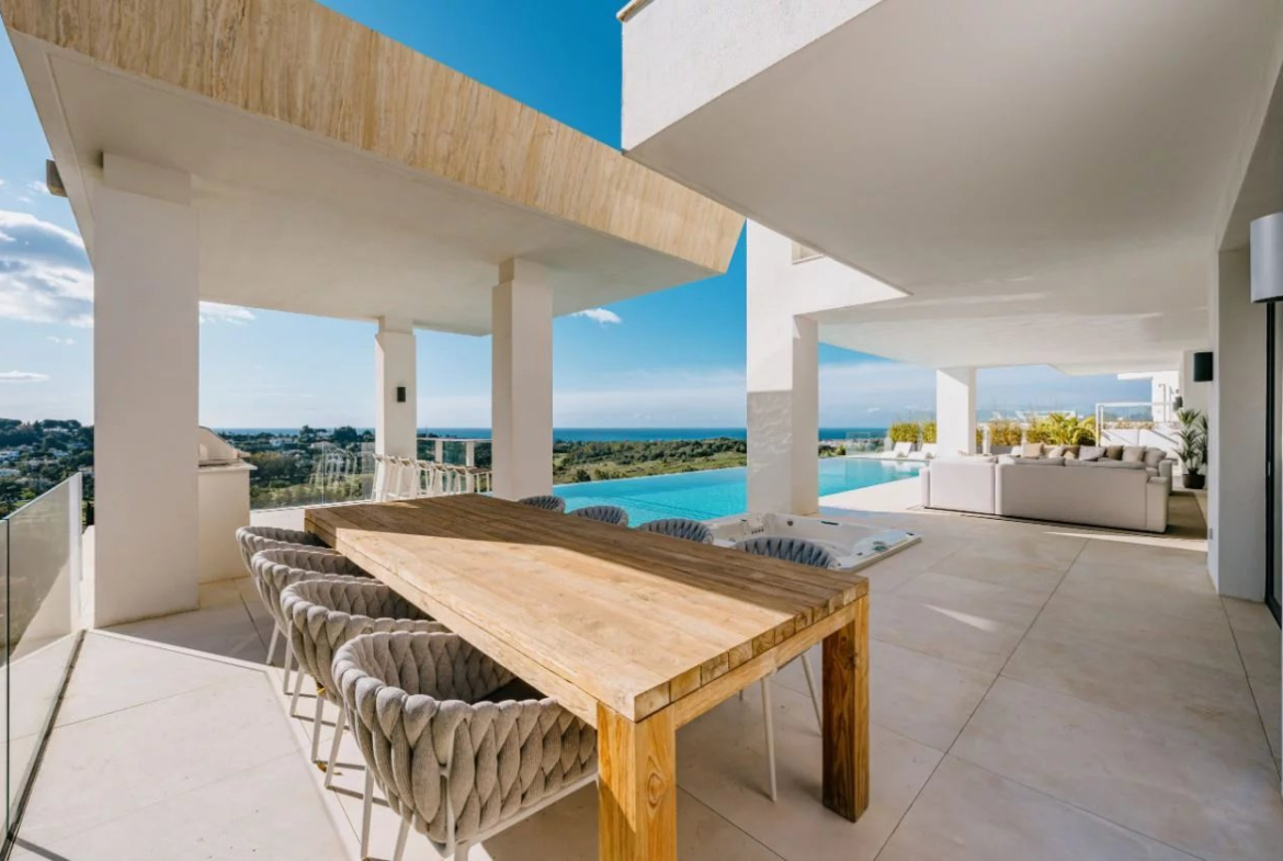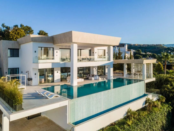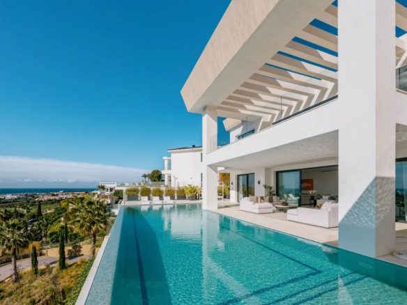 Situé sur un terrain de 2.500m², le spectaculaire manoir orienté au sud de 1.841m² est construit selon les normes les plus élevées et offre un design contemporain et moderne combiné avec un cadre naturel magnifique et des vues panoramiques à couper le souffle sur la mer Méditerranée, le parcours de golf et environnement parfait. Remarquable, spacieux et respectueux de l’environnement, il dispose d’un élégant salon avec une bio-cheminée et de grandes fenêtres avec accès à un grand porche et au jardin et à la piscine ; une cuisine design ultramoderne entièrement équipée et un coin repas; 7 chambres avec 7 salles de bains attenantes (marbre, double vasque, cabines de douche, baignoires, jacuzzi), 2 toilettes invités, salles de cinéma et de jeux.