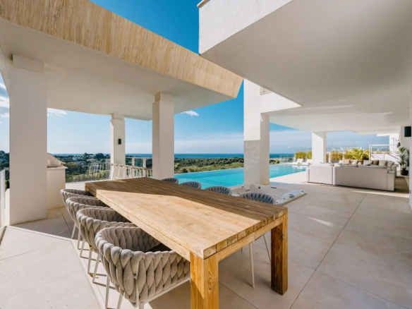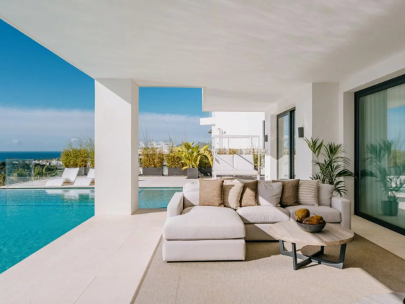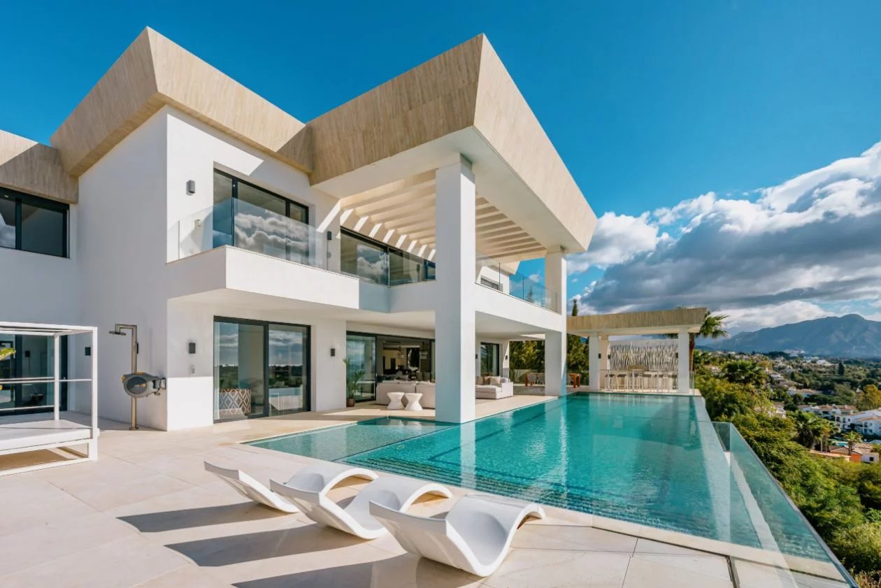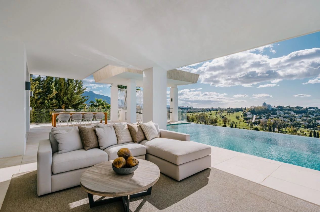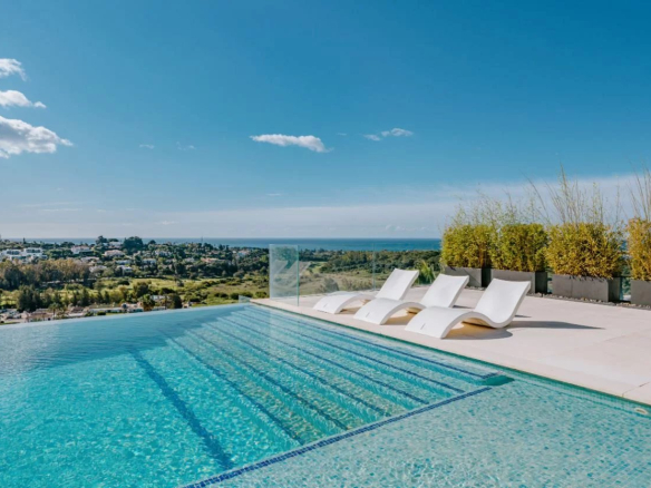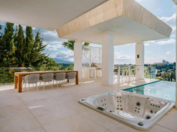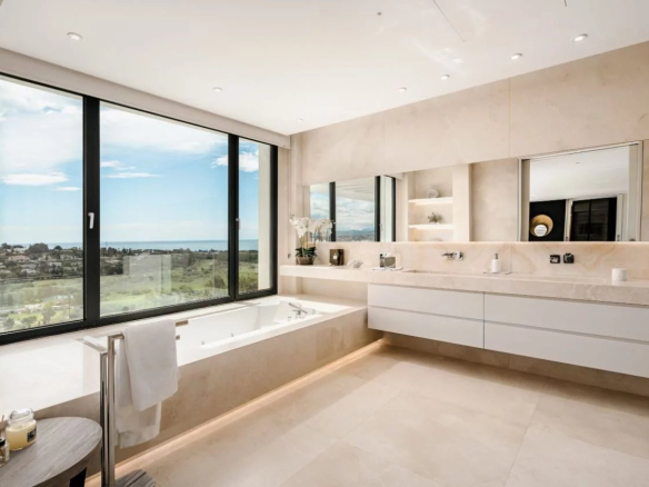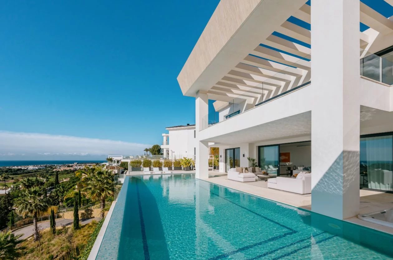 Situé sur un terrain de 2.500m², le spectaculaire manoir orienté au sud de 1.841m² est construit selon les normes les plus élevées et offre un design contemporain et moderne combiné avec un cadre naturel magnifique et des vues panoramiques à couper le souffle sur la mer Méditerranée, le parcours de golf et environnement parfait. Remarquable, spacieux et respectueux de l’environnement, il dispose d’un élégant salon avec une bio-cheminée et de grandes fenêtres avec accès à un grand porche et au jardin et à la piscine ; une cuisine design ultramoderne entièrement équipée et un coin repas; 7 chambres avec 7 salles de bains attenantes (marbre, double vasque, cabines de douche, baignoires, jacuzzi), 2 toilettes invités, salles de cinéma et de jeux.