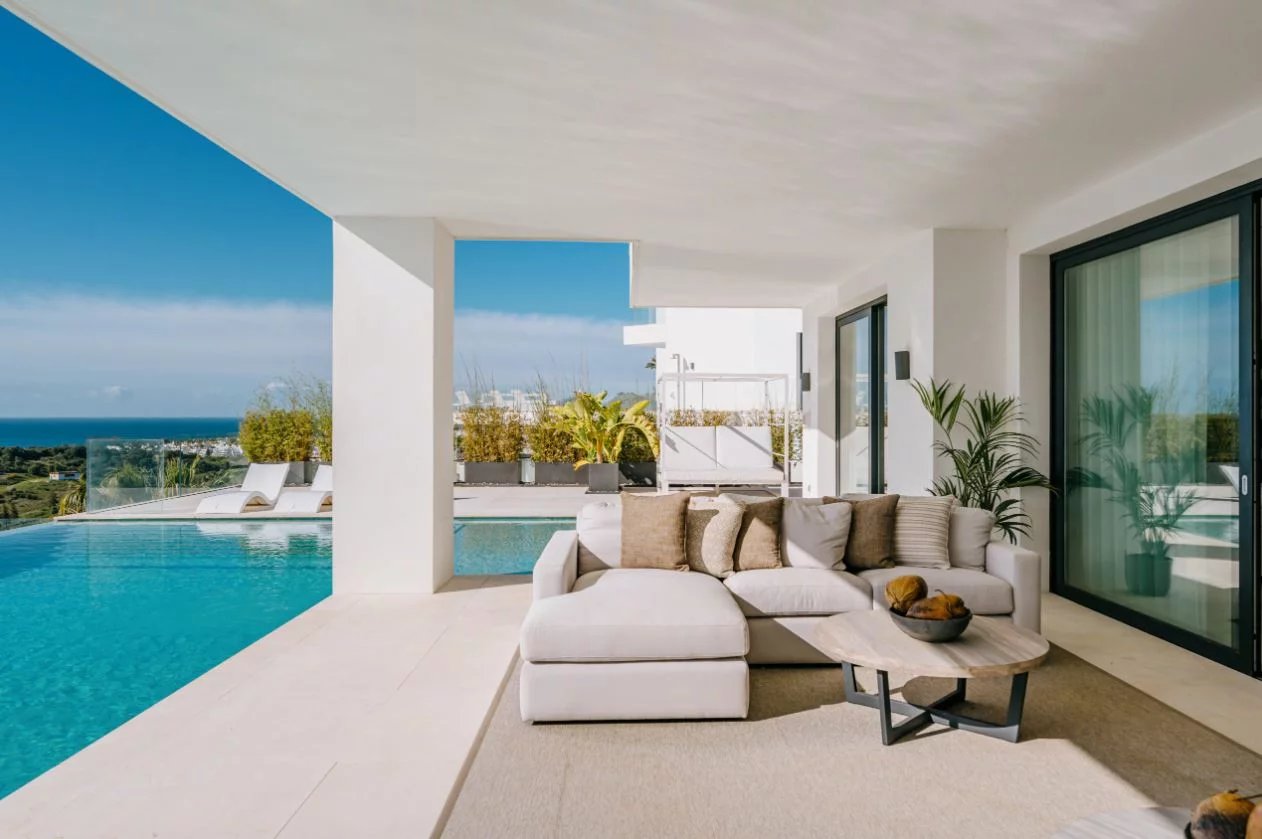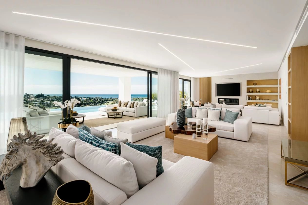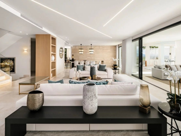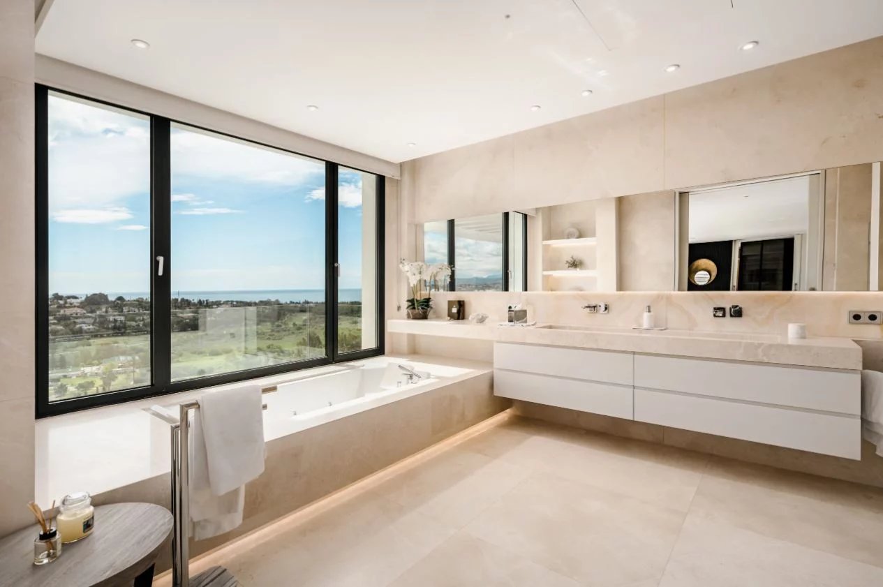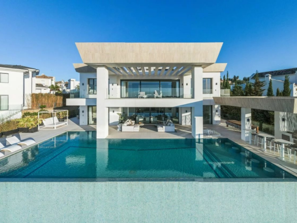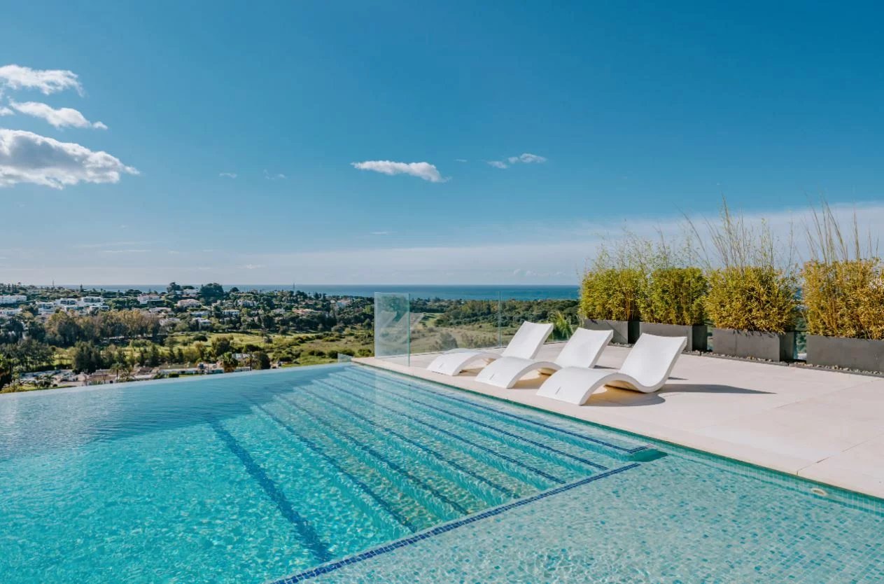 Situé sur un terrain de 2.500m², le spectaculaire manoir orienté au sud de 1.841m² est construit selon les normes les plus élevées et offre un design contemporain et moderne combiné avec un cadre naturel magnifique et des vues panoramiques à couper le souffle sur la mer Méditerranée, le parcours de golf et environnement parfait. Remarquable, spacieux et respectueux de l’environnement, il dispose d’un élégant salon avec une bio-cheminée et de grandes fenêtres avec accès à un grand porche et au jardin et à la piscine ; une cuisine design ultramoderne entièrement équipée et un coin repas; 7 chambres avec 7 salles de bains attenantes (marbre, double vasque, cabines de douche, baignoires, jacuzzi), 2 toilettes invités, salles de cinéma et de jeux.