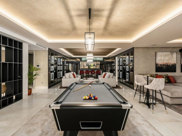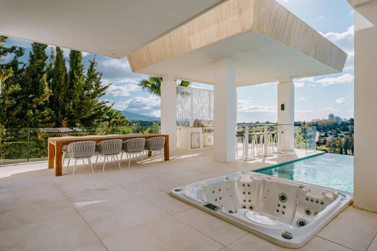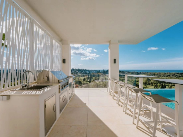 Profitez des zones de divertissement et de détente désignées à l’extérieur, et trouvez des plaisirs de détente ou de remise en forme dans votre club de santé avec une salle de sport, un sauna et une terrasse de yoga. Les terrasses couvertes et ensoleillées de 341 m² ont tout ce dont vous avez besoin pour profiter du style de vie méditerranéen de renommée mondiale, y compris les zones de détente, de repas en plein air, de barbecue et de solarium. La grande piscine à débordement avec cascade ajoute de l’exclusivité. Il en va de même pour le garage privé pour 10 voitures.