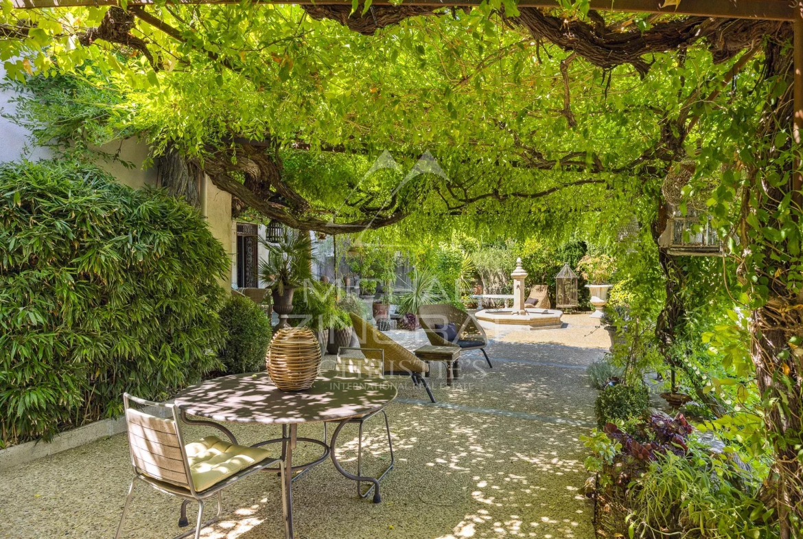 À l’extérieur, le jardin paysager en restanques de 2 400 m² constitue un cadre verdoyant et apaisant. Il accueille une piscine chauffée en mosaïque, une grande terrasse ombragée avec fontaine, un verger d’oliviers et d’arbres fruitiers, ainsi qu’un potager aux essences méditerranéennes, parfaitement intégré dans l’environnement.