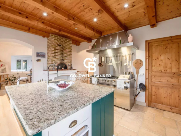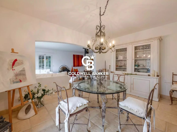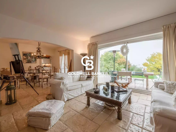 À l’intérieur, la maison propose un vaste séjour lumineux grâce à de larges baies vitrées ouvrant sur la terrasse et la véranda avec vue sur les massifs environnants. Une cheminée complète l’espace de vie.