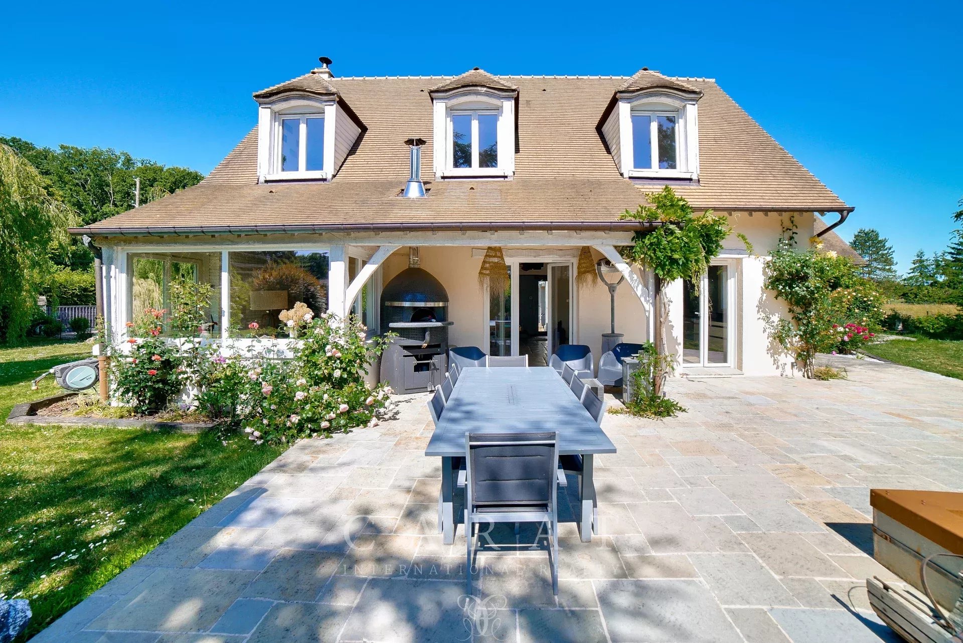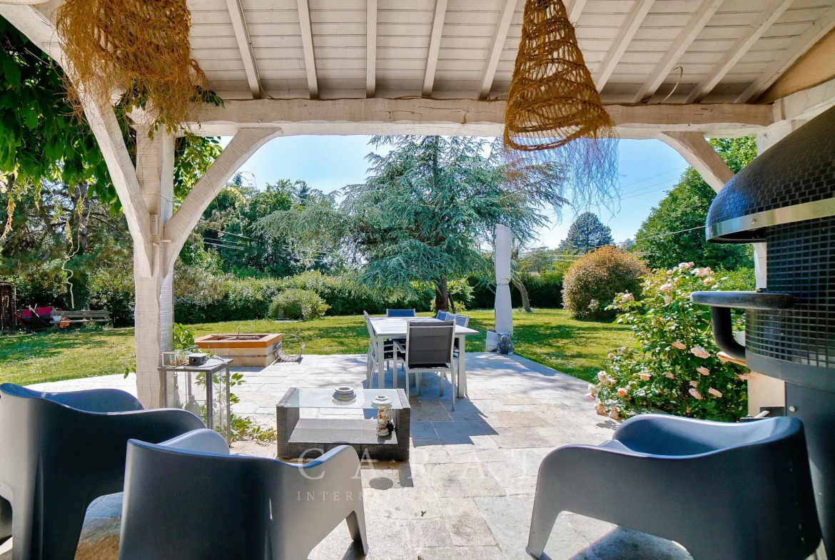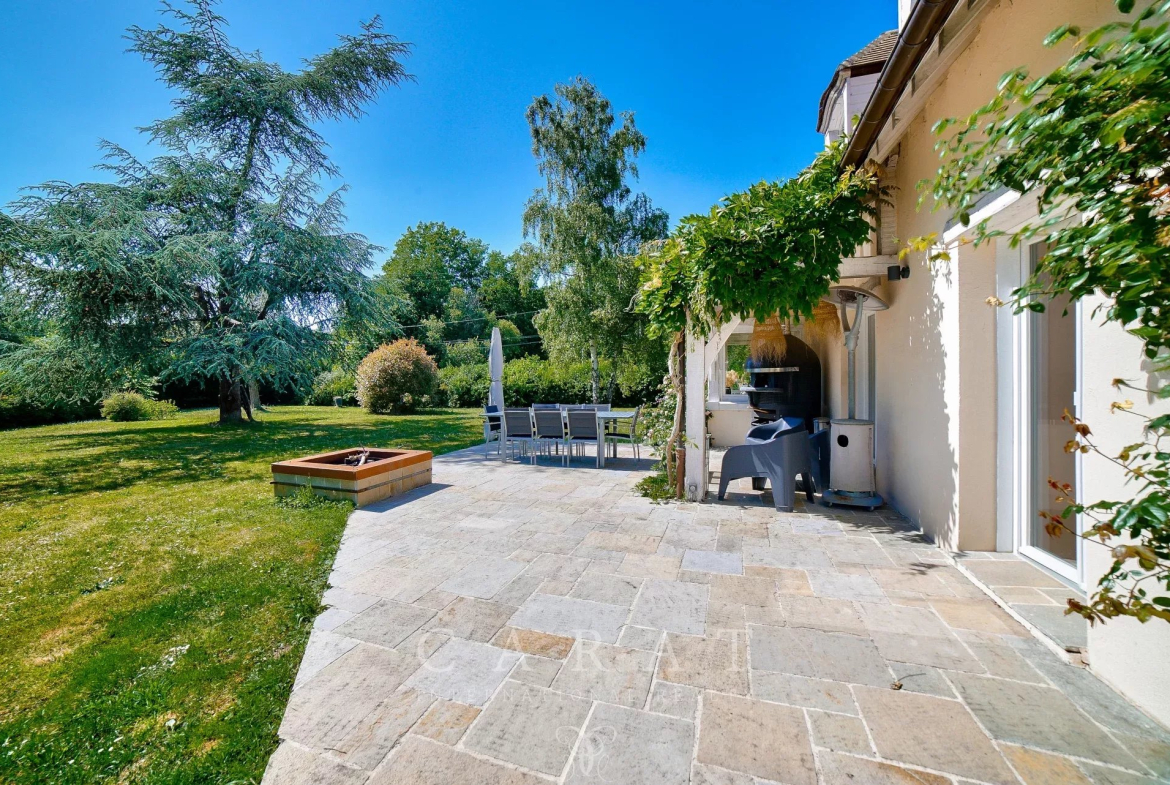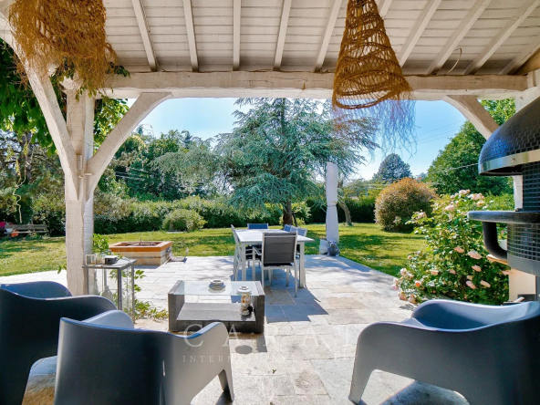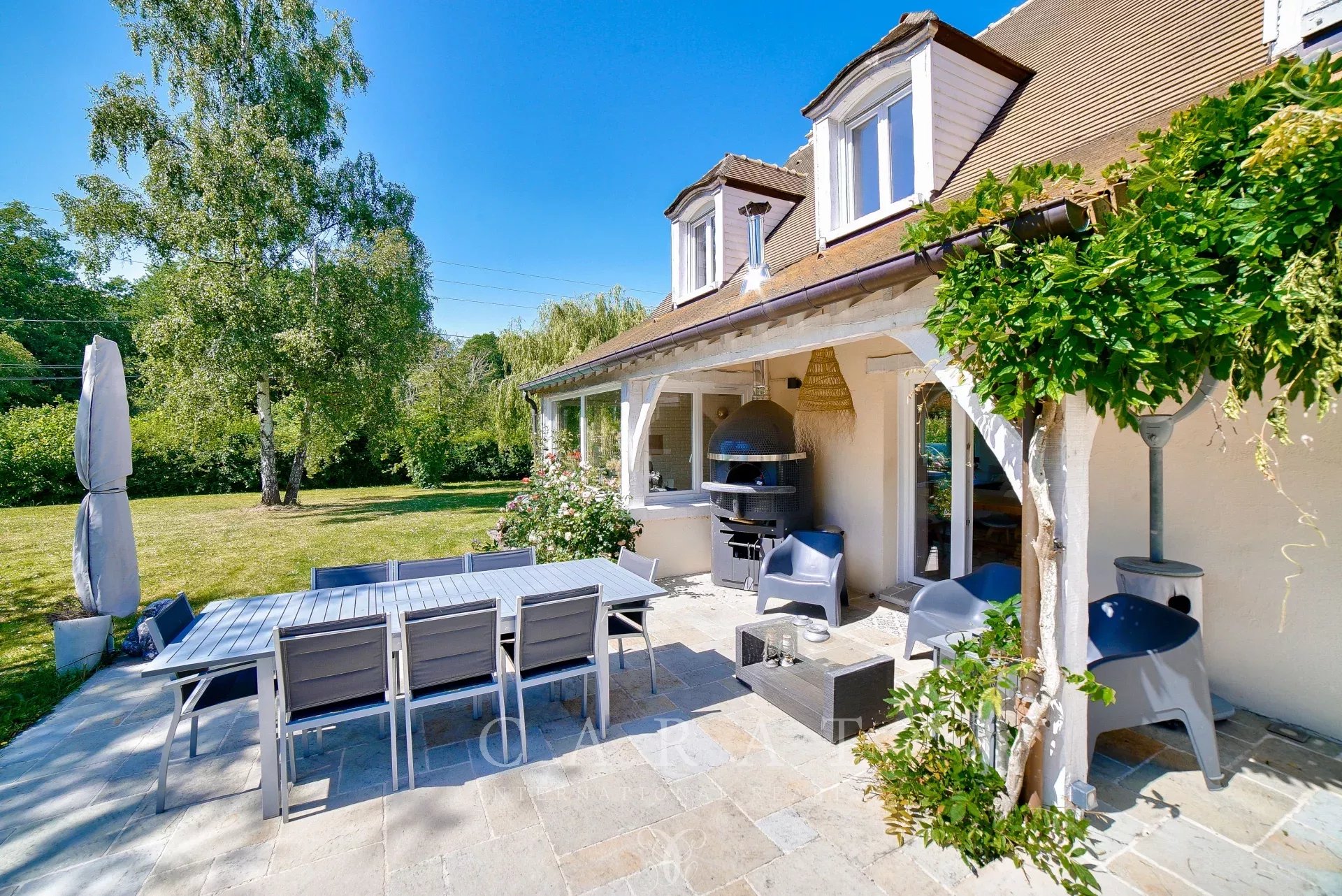 Extérieurs aménagés : Grande terrasse avec four à pizza, idéale pour les repas en plein air.