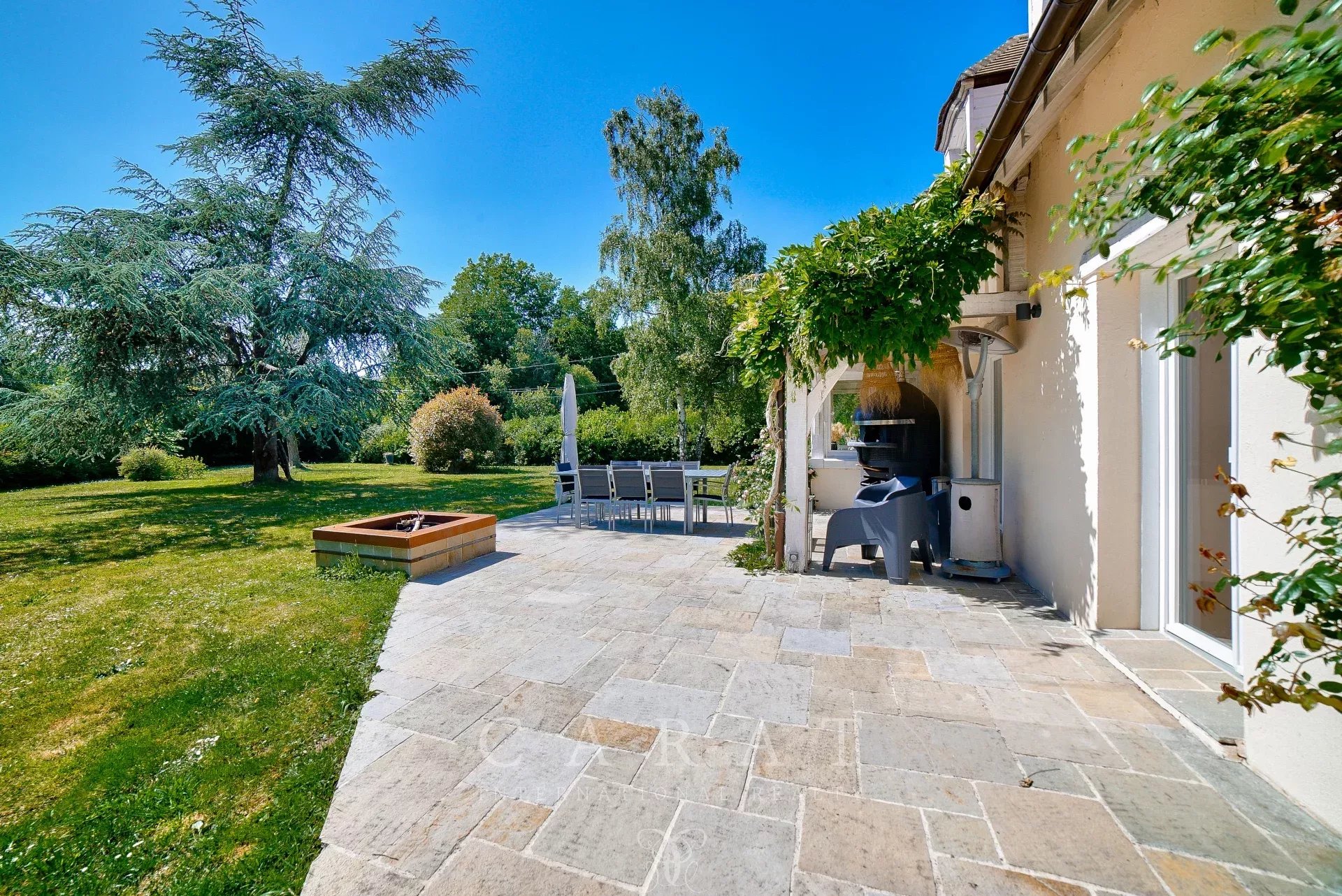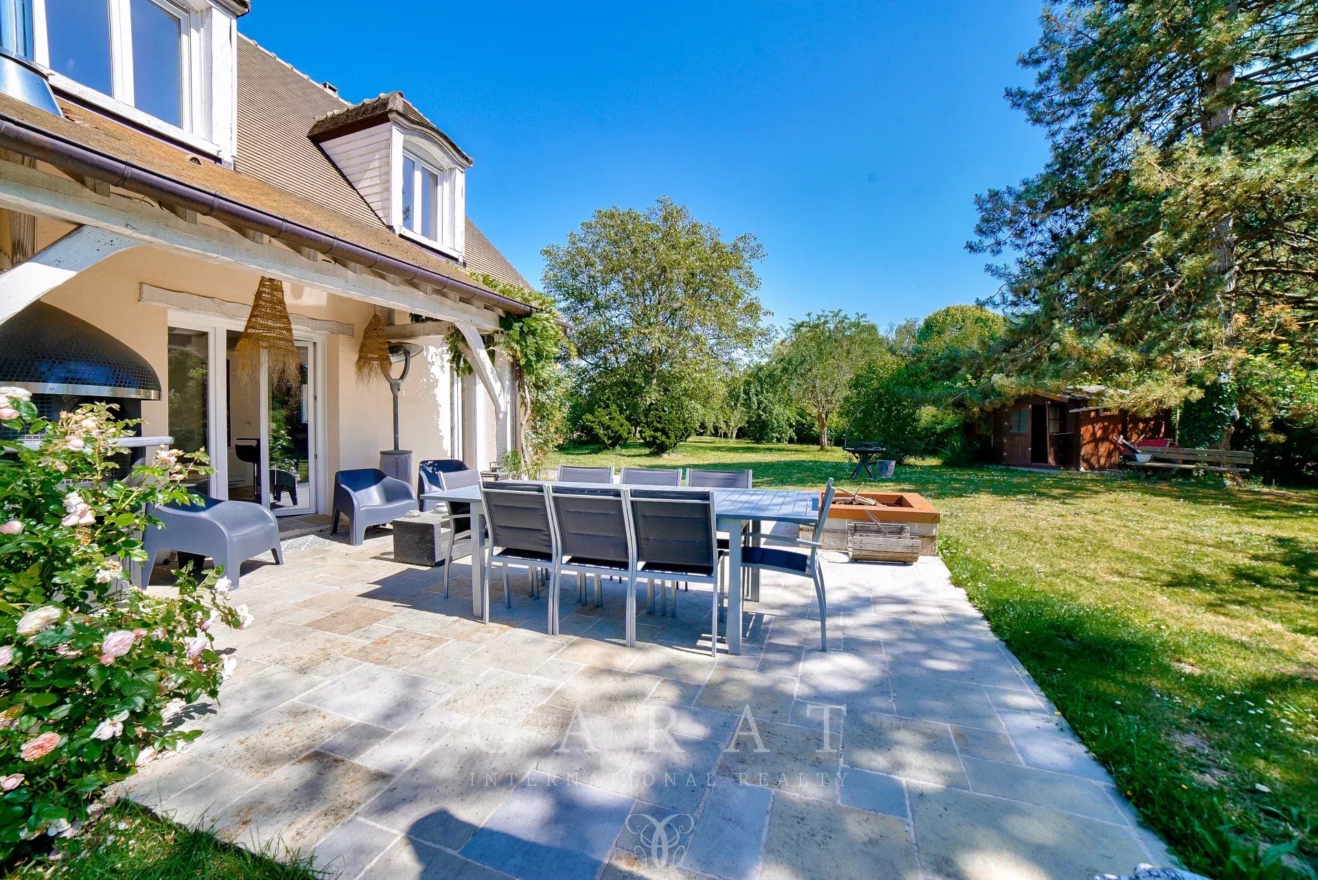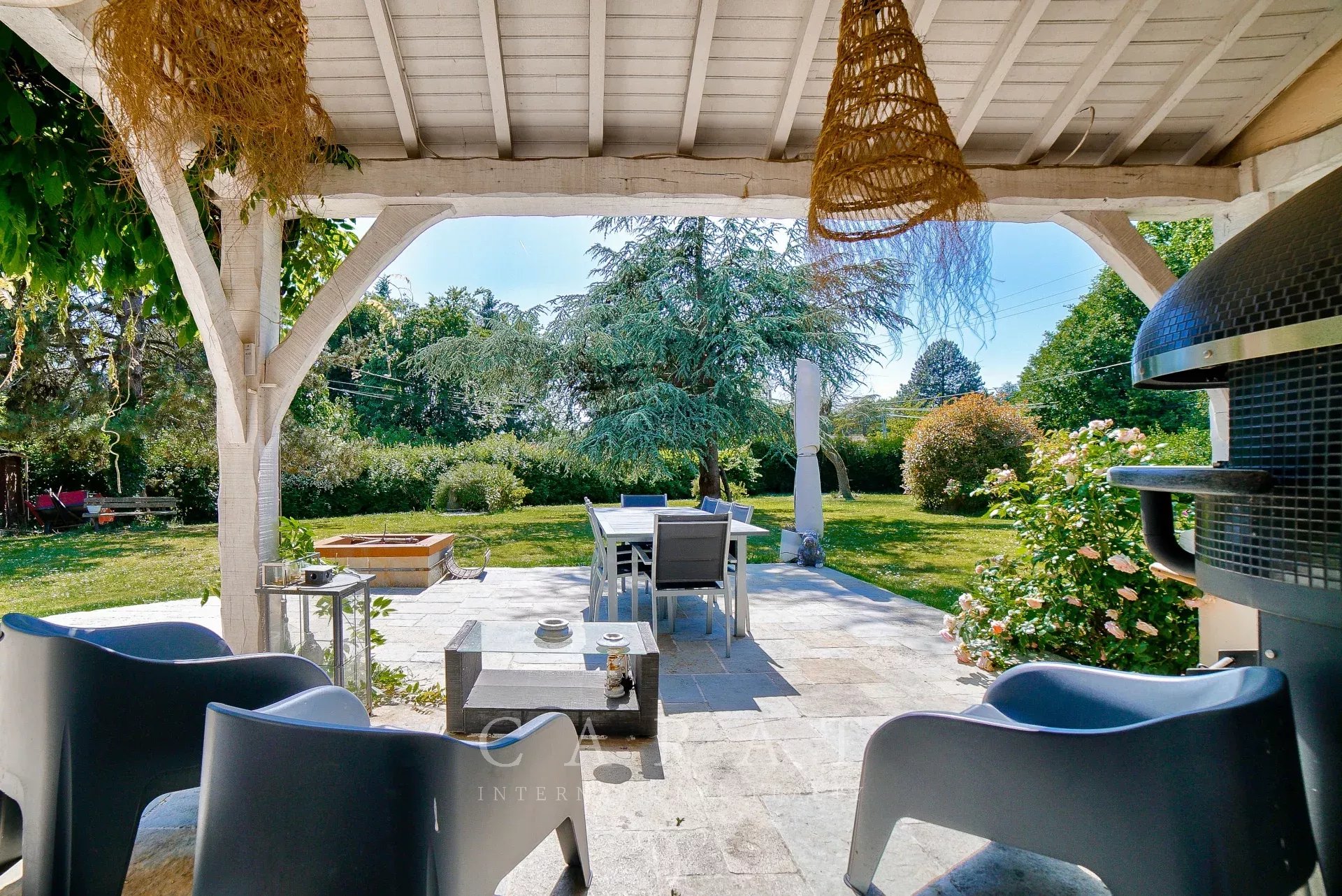 Extérieurs aménagés : Grande terrasse avec four à pizza, idéale pour les repas en plein air.