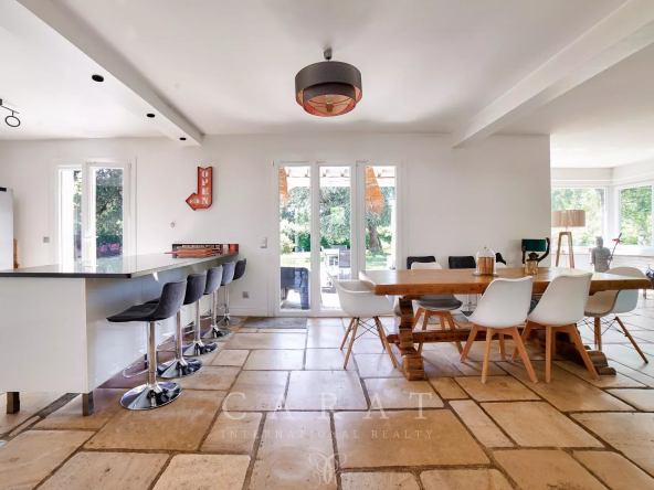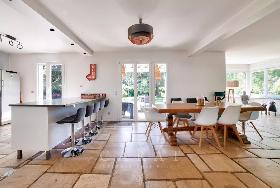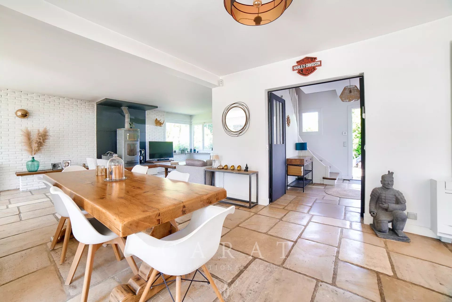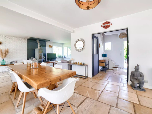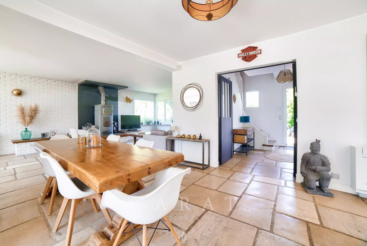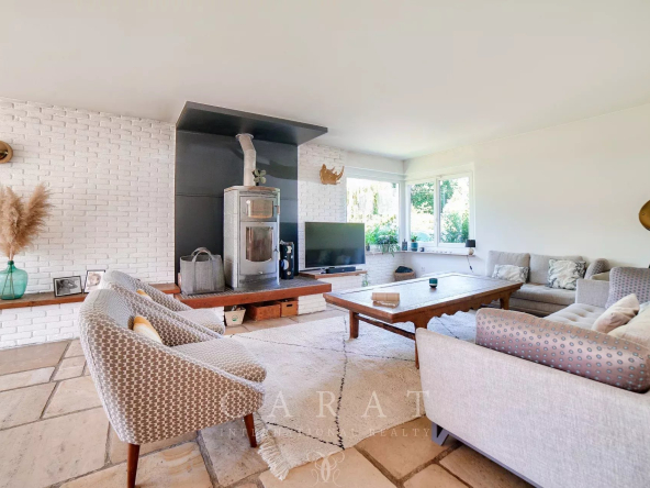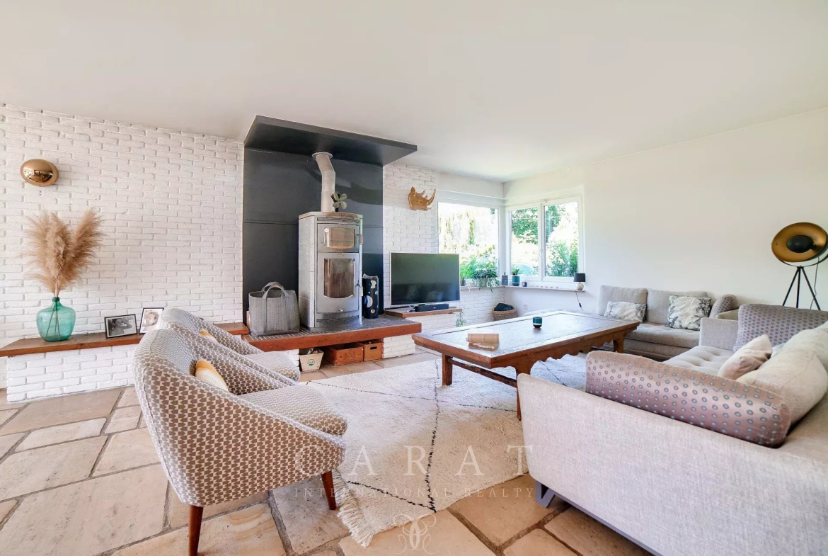 Volumes généreux : Une vaste pièce de vie traversante avec poêle à bois, baignée de lumière grâce à de grandes baies vitrées et un sol en pierre de Bourgogne.