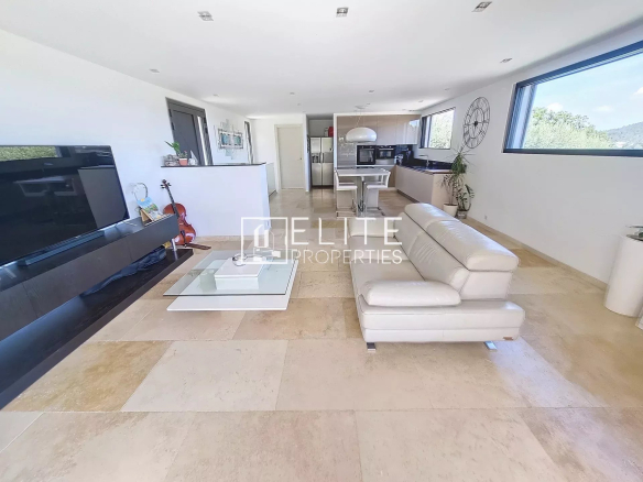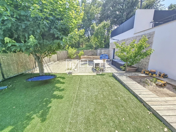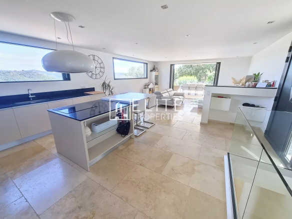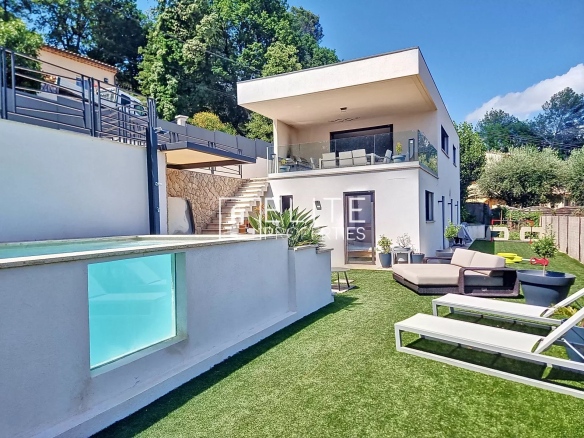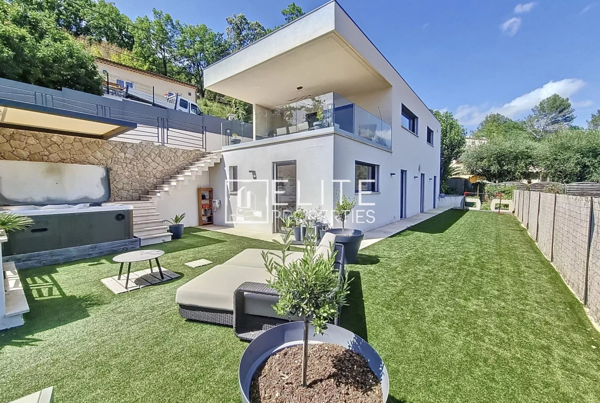 Le Tignet : maison moderne individuelle construite en 2021, de 4 pièces de 123m² sur 780m² de terrain avec piscine chauffée de 10m², jacuzzi, terrain de pétanque.