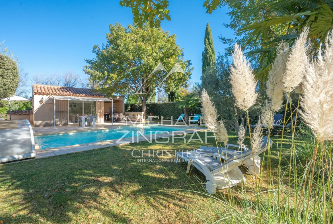 Construite en 1995 et très bien entretenue, cette maison néo-provençale développe une surface de 157m² habitables sur une jolie parcelle de 3000m² avec piscine et studio indépendant.