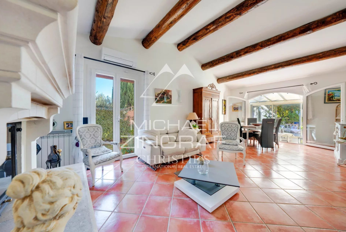 L’entrée ouvre discrètement sur une vaste et chaleureuse pièce à vivre avec salon, salle à manger et cheminée prolongée par une agréable véranda.