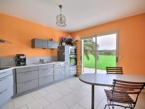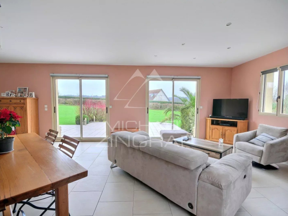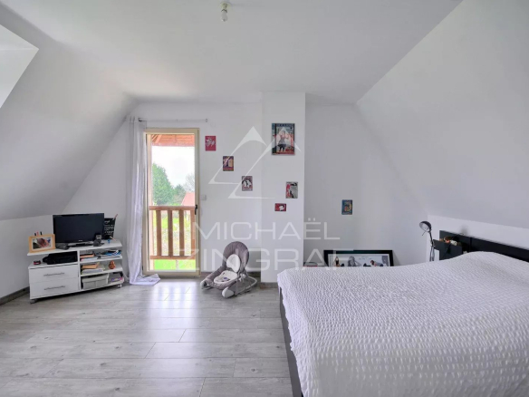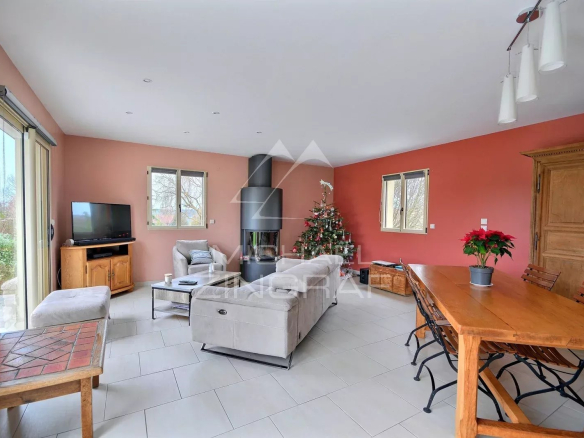 La maison, construite sur un radier, d’une surface d’environ 160m² présente au rez-de-chaussée : une grande entrée, un chaleureux et vaste séjour – salle à manger avec poêle à bois et baies vitrées donnant sur une terrasse ainsi qu’une cuisine ouverte aménagée et équipée. Elle comprend trois chambres au premier étage et une superbe suite parentale avec dressing de plain-pied.
