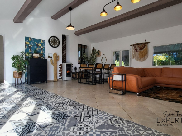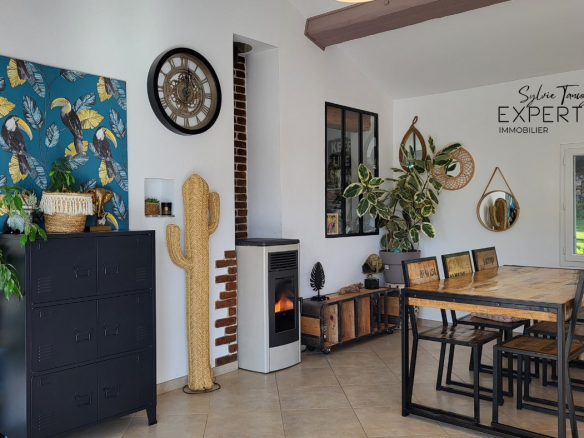 Extérieur et équipements : carport, portail électrique, visiophone, aire de parking. Climatisation réversible, poêles à granules, micro-station d’assainissement, menuiseries en double vitrage récente.