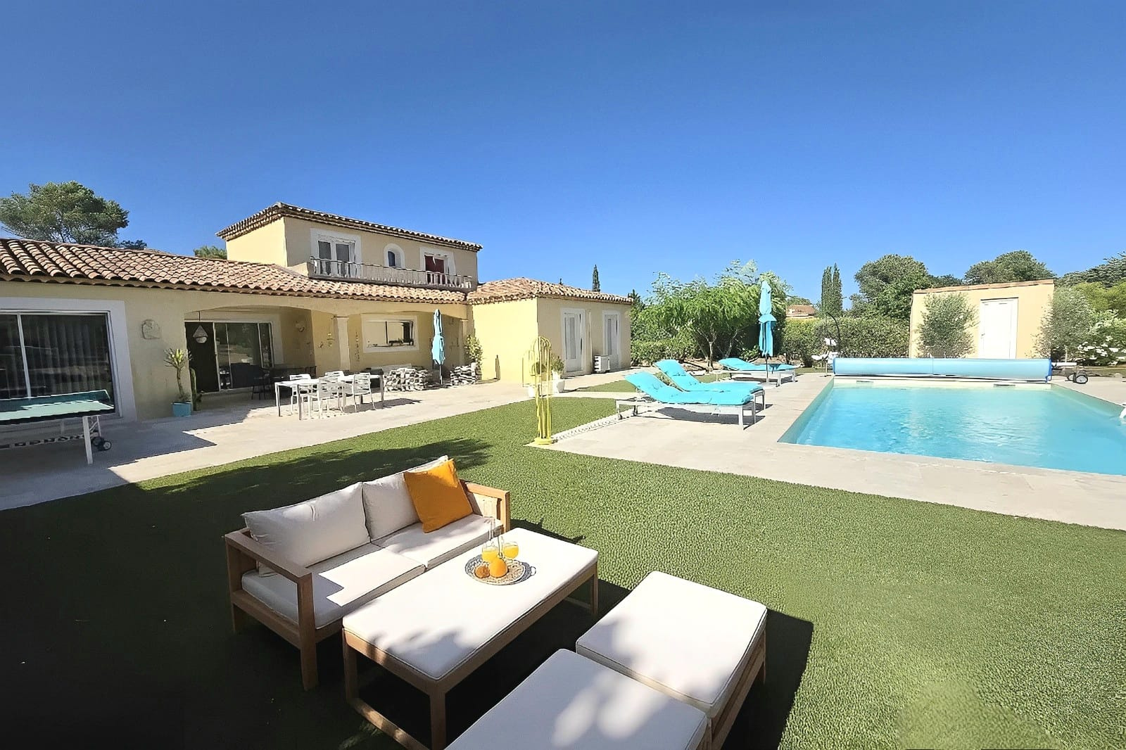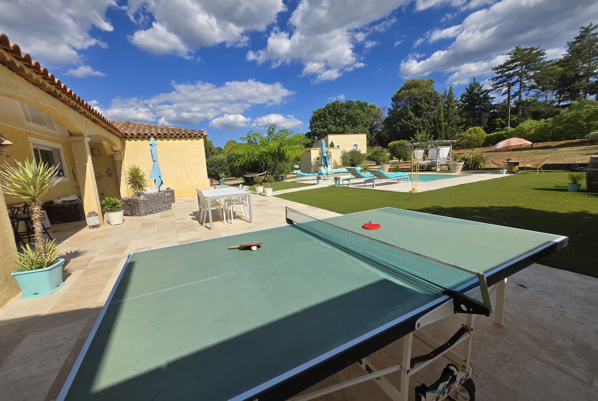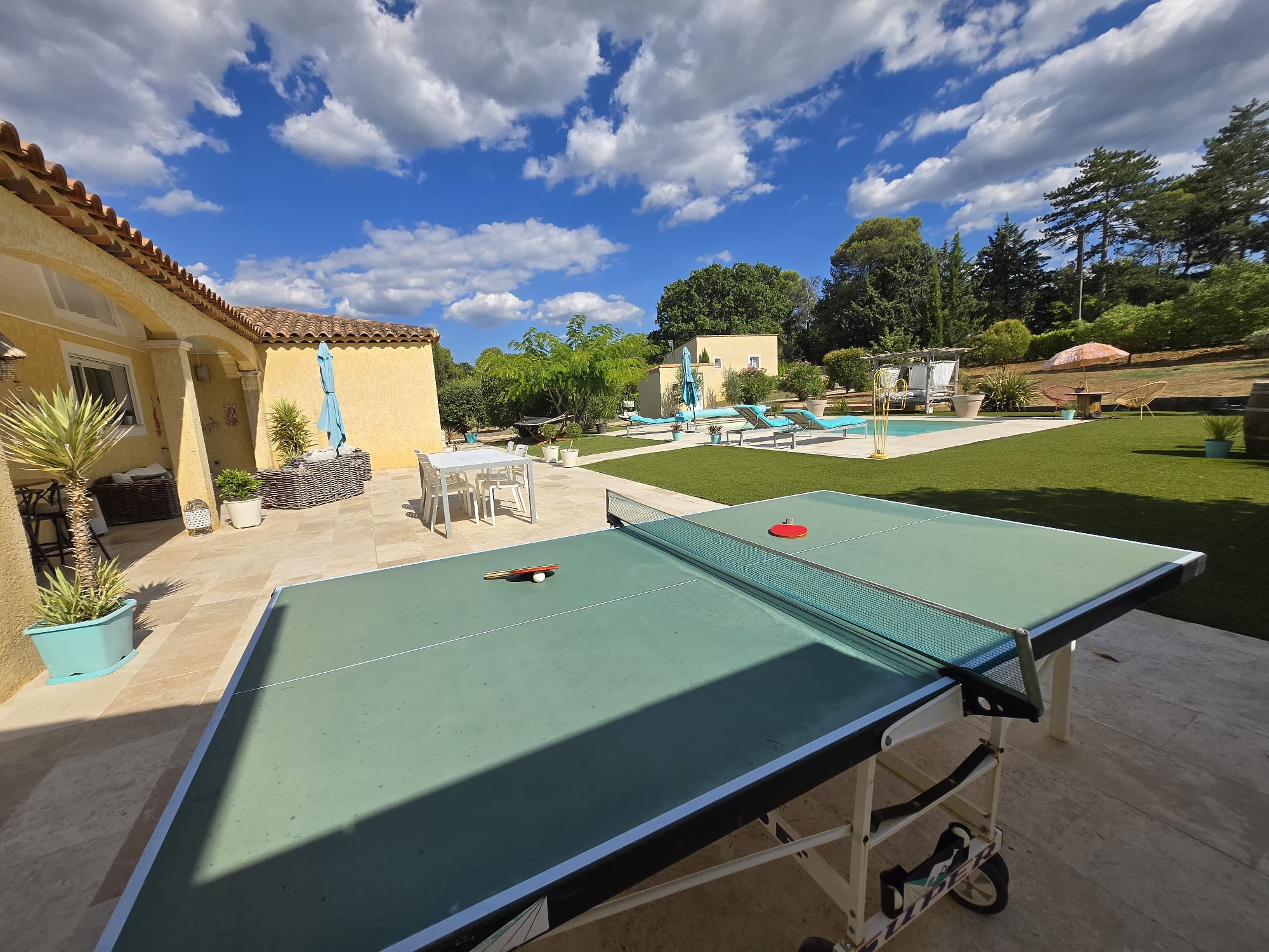 A l’extérieur, vous profiterez d’une piscine de 9 x 4 m bordée de vastes terrasses en travertin, d’un terrain de pétanques, d’un terrain de jeux et d’un coin farniente pour se détendre durant les belles journées d’été.