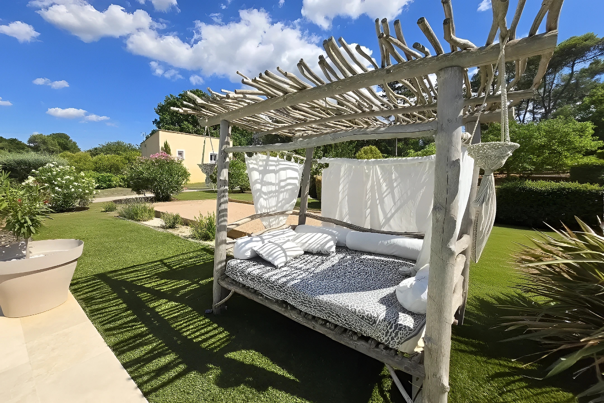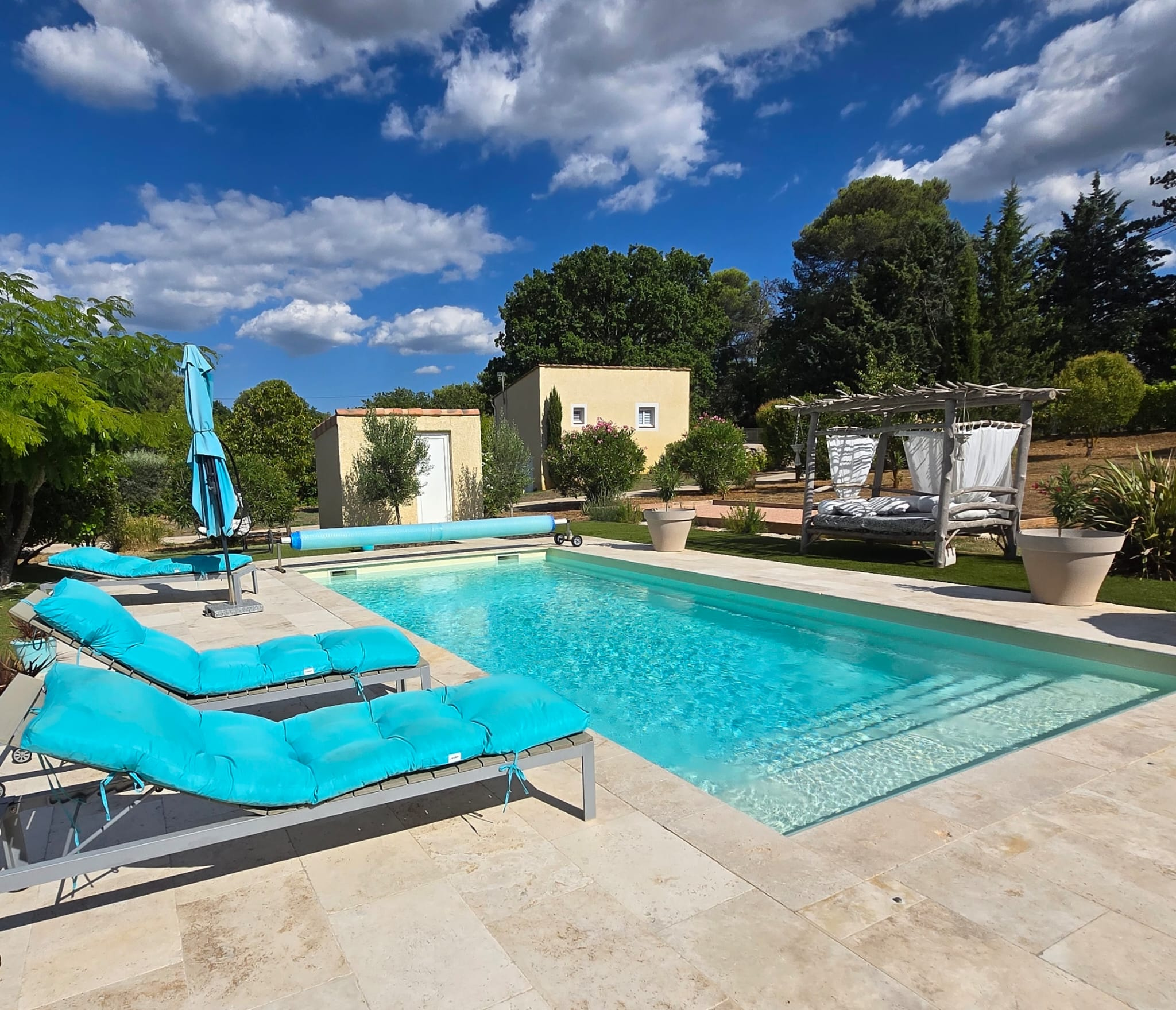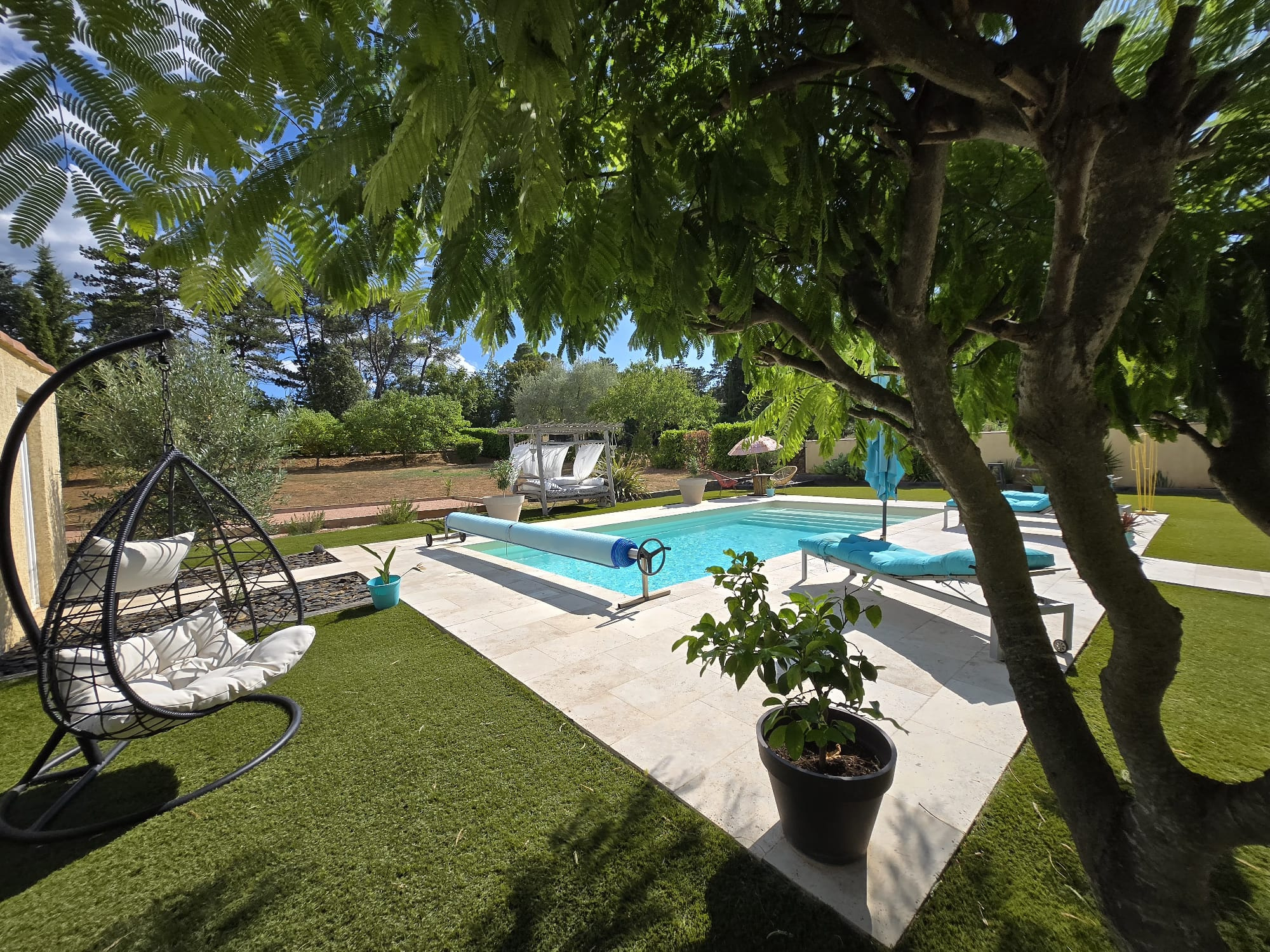 A l’extérieur, vous profiterez d’une piscine de 9 x 4 m bordée de vastes terrasses en travertin, d’un terrain de pétanques, d’un terrain de jeux et d’un coin farniente pour se détendre durant les belles journées d’été.