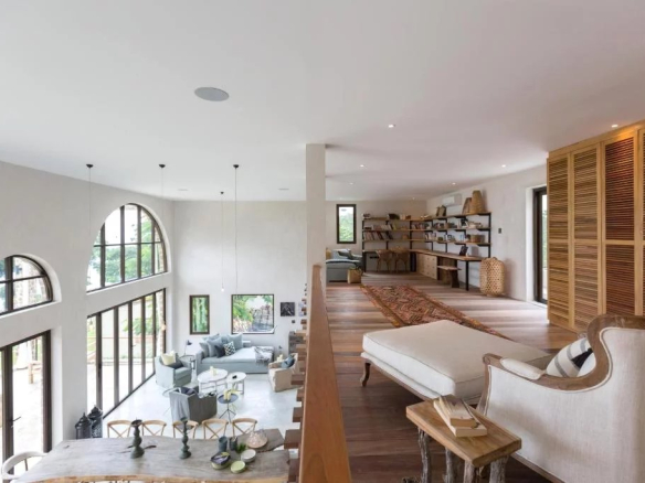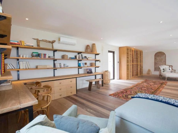 Il y a une cuisine ultramoderne entièrement équipée avec un vaste plan de travail pour la préparation des aliments pour les grands dîners. Des escaliers en bois mènent du salon à la mezzanine où se trouve une bibliothèque privée avec coin bureau/ordinateur.