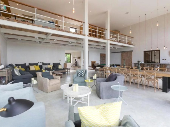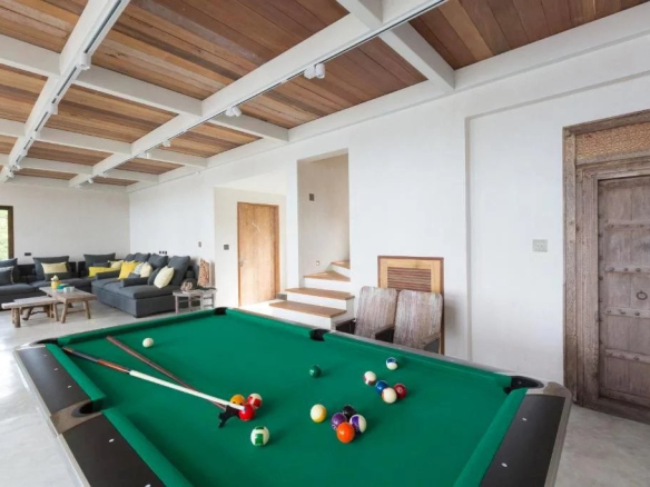 Le pavillon principal comprend l’espace de vie commun principal, ainsi que la luxueuse chambre principale, la bibliothèque et le centre d’affaires. Le salon et la salle à manger décloisonnés disposent de canapés surdimensionnés et d’une table à manger en bois massif pouvant accueillir jusqu’à 18 personnes. Il est desservi par un bar intégré et une somptueuse cuisine de style campagnard. Le bâtiment principal abrite également d’excellentes installations de divertissement, notamment une table de billard, un baby-foot et un jeu de fléchettes.