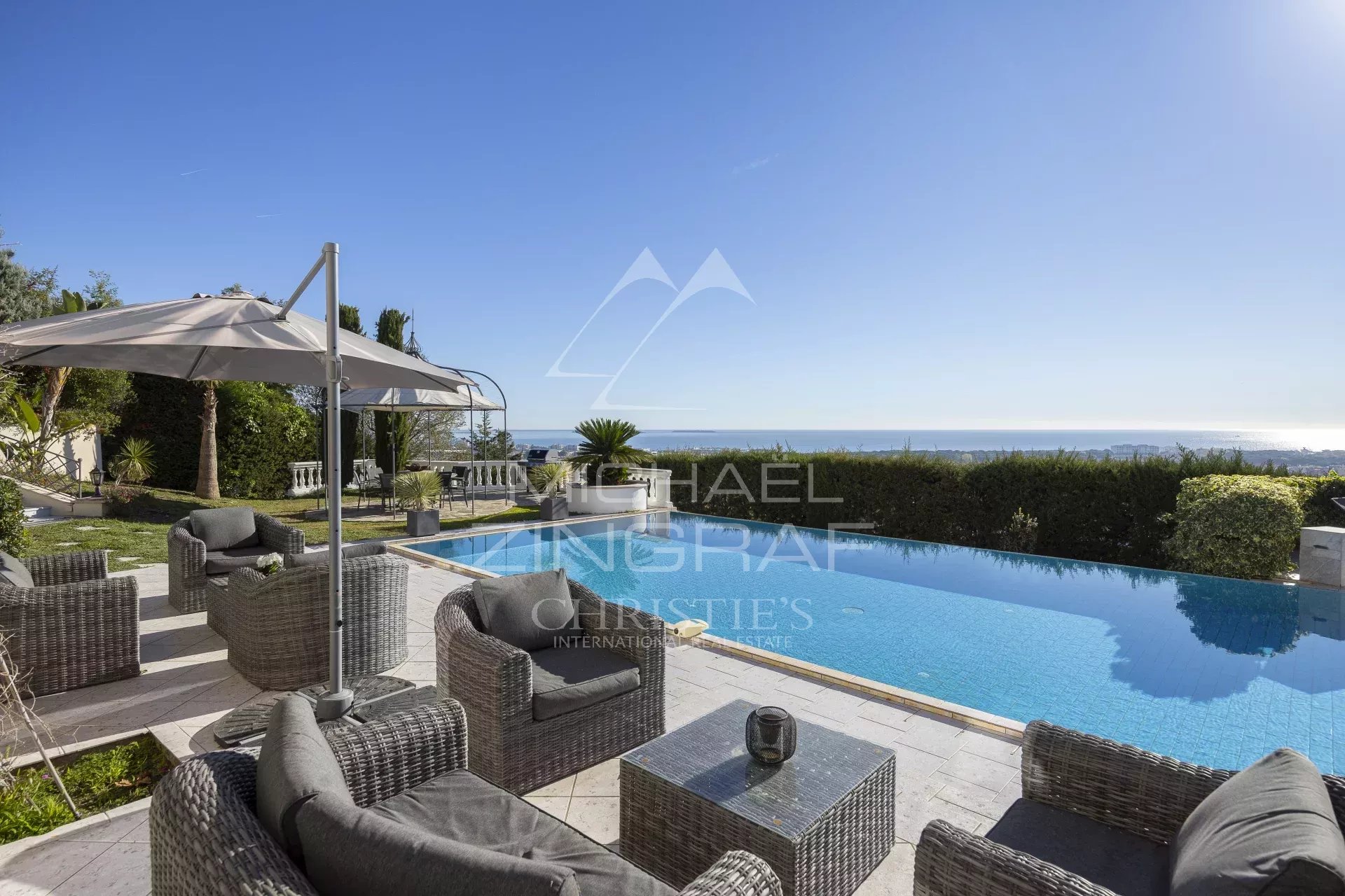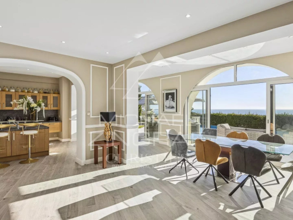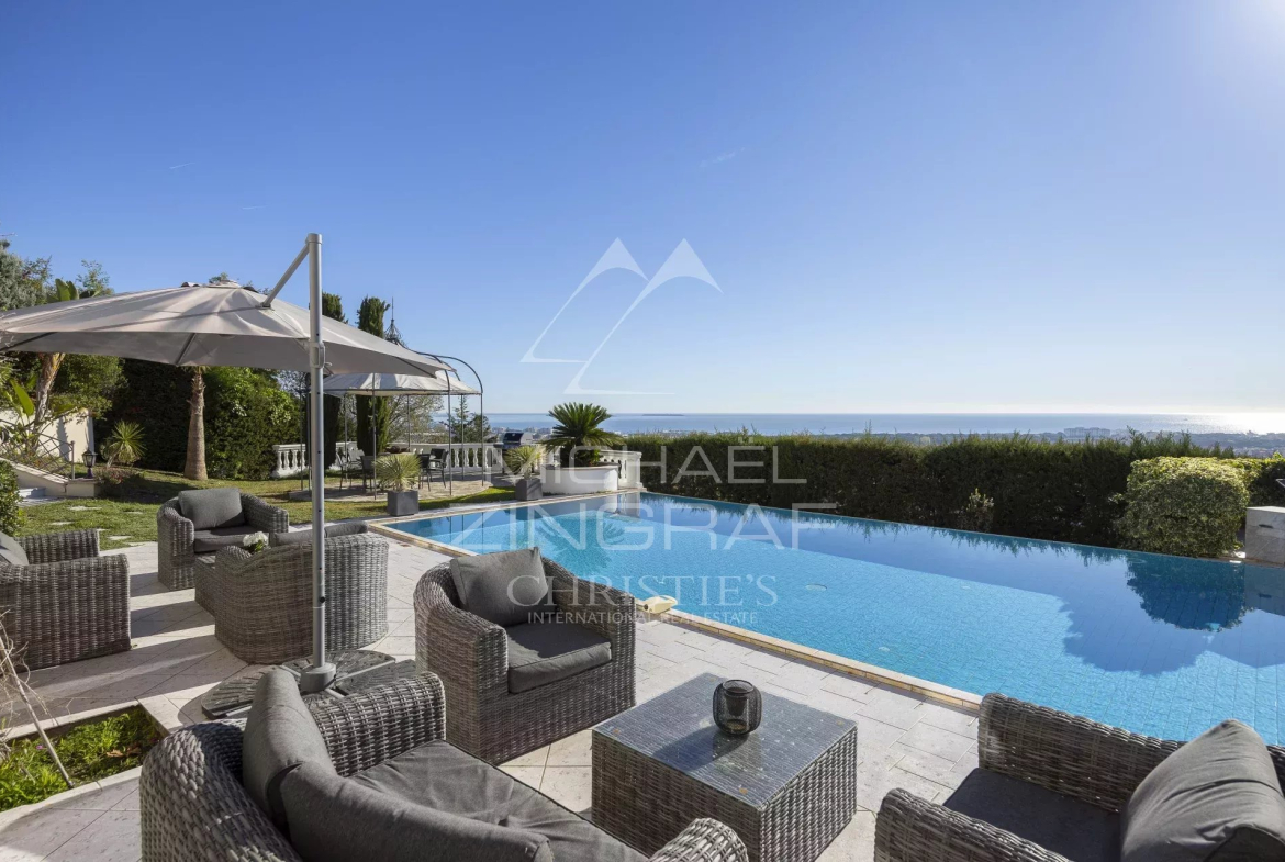 Idéalement située sur la colline des Termes, cette propriété familiale rénovée et exposée plein sud offre une superbe vue sur la mer, de Cannes à Théoule. La villa principale comporte 4 suites ainsi que une grande pièce de vie ouvrant sur une terrasse avec piscine à débordement. La maison d’invites propose 2 chambres supplémentaire avec cuisine et 2 grands garages. A seulement 5 minutes de Cannes , 10 minutes des plages et des restaurants du port du la Napoule, et 15 minutes de la Croisette.