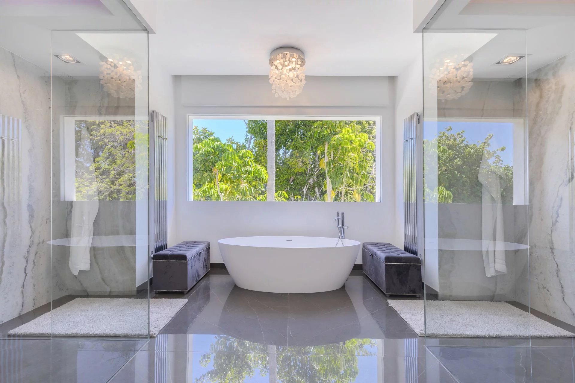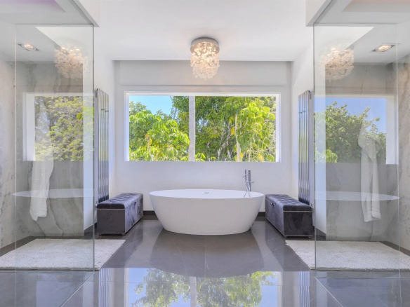 Au premier étage, la suite parentale dispose d’une grande terrasse privée avec vue sur la piscine et le jardin. Une salle de bains privative dispose d’impressionnantes douches doubles Onyx, d’une baignoire sur pieds et de dressings. Il y a un total de six chambres dans la propriété, avec un bureau supplémentaire au premier étage.