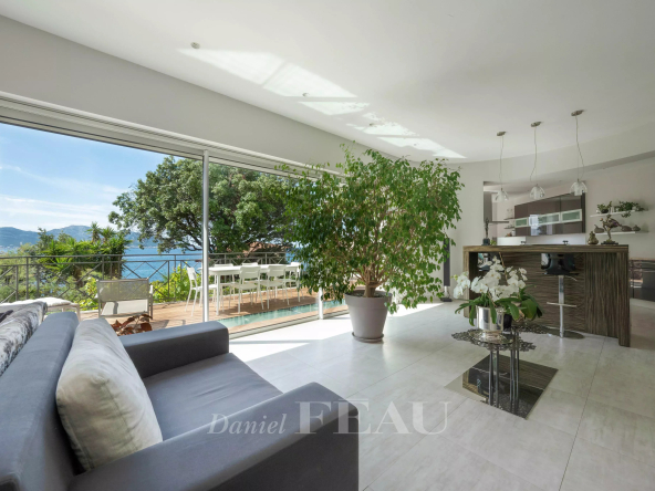 En rez-de-chaussée surélevé : d’un vaste séjour vue mer avec terrasse attenante orientée Sud, une cuisine ouverte avec cellier à l’arrière, un bureau.
