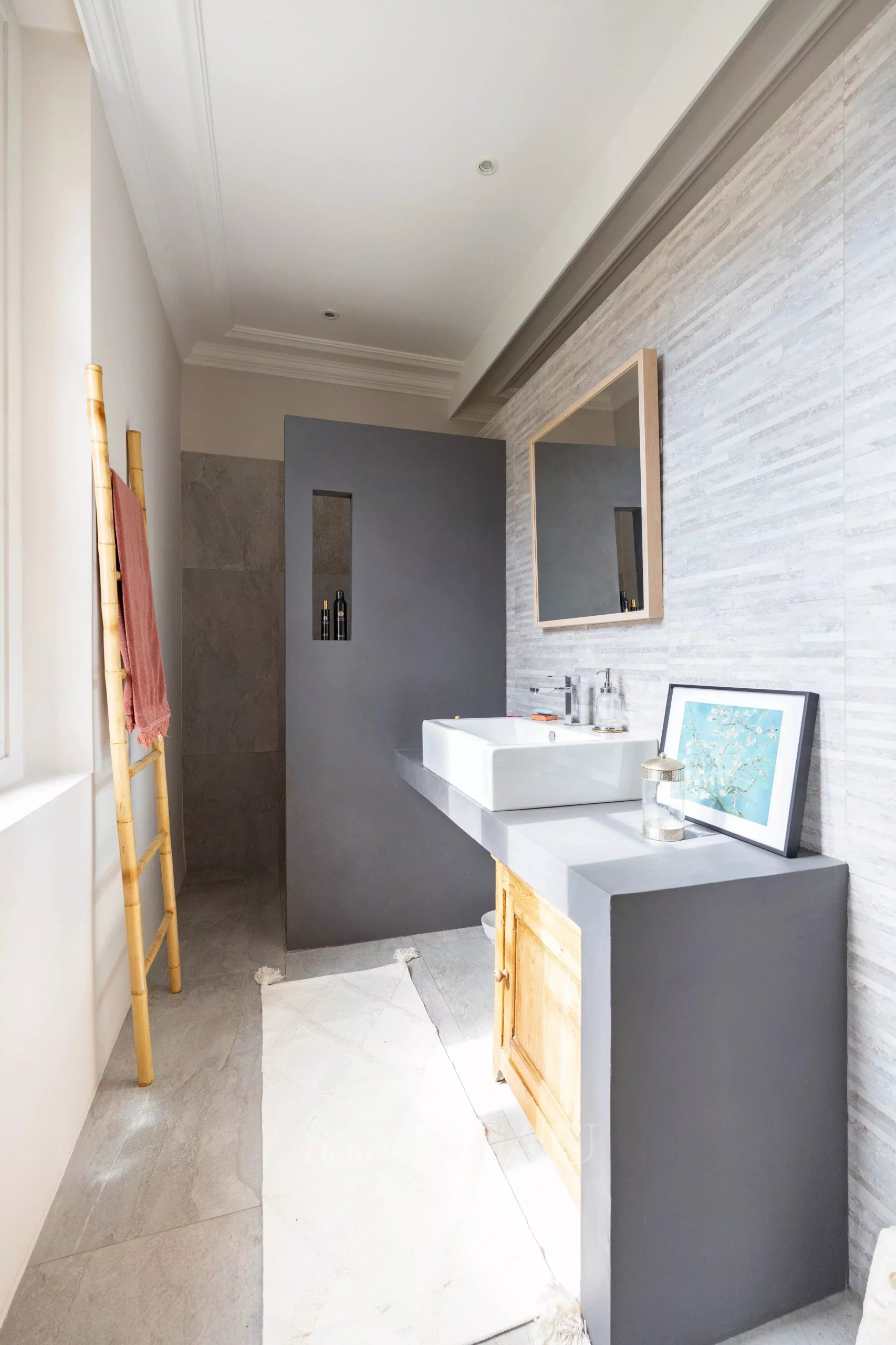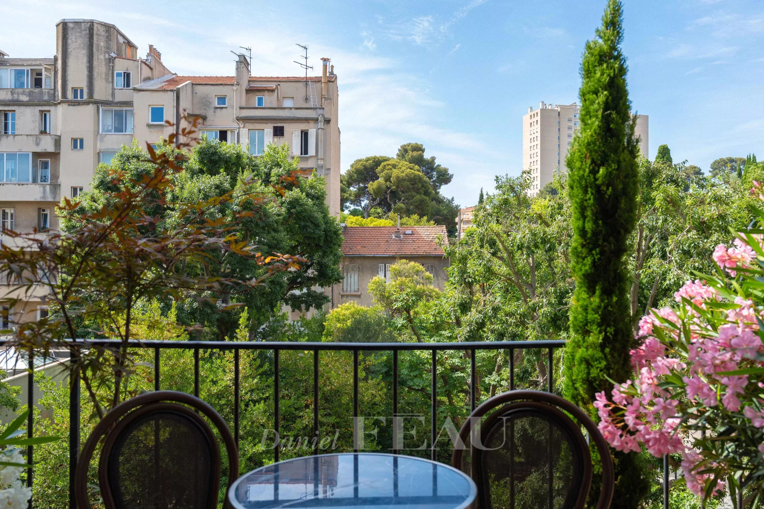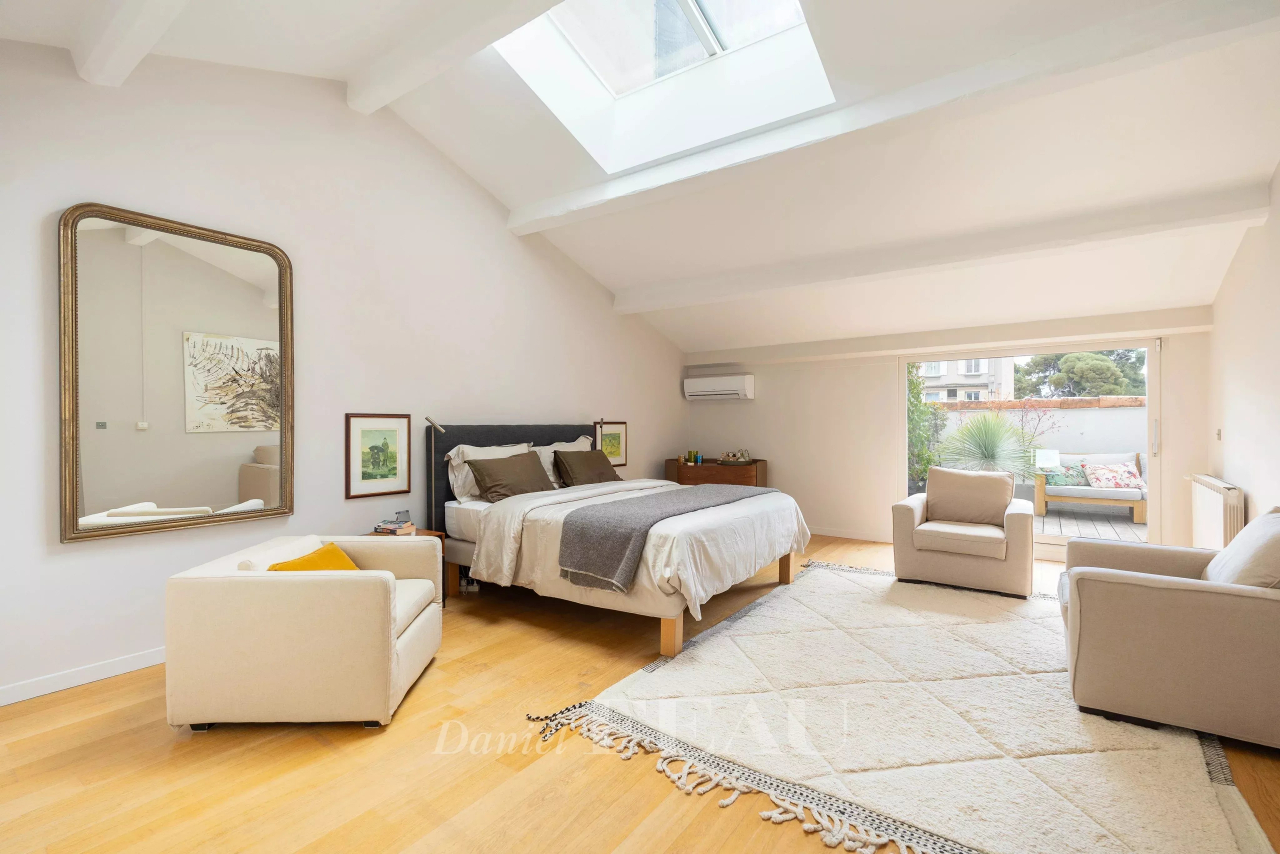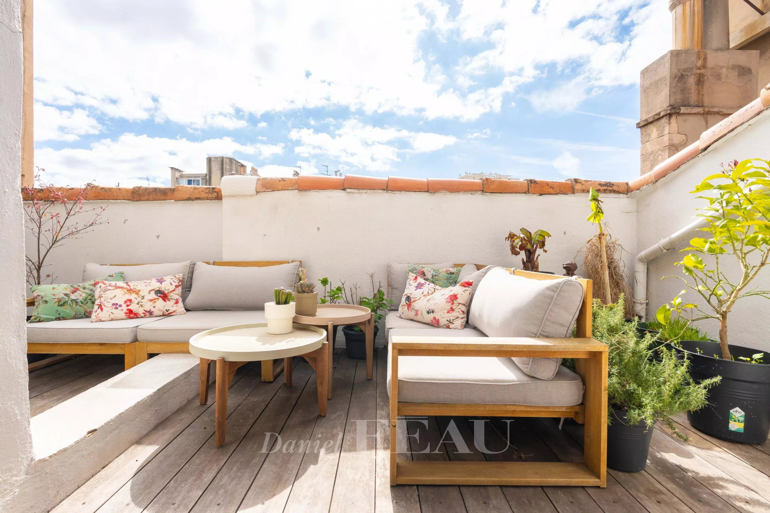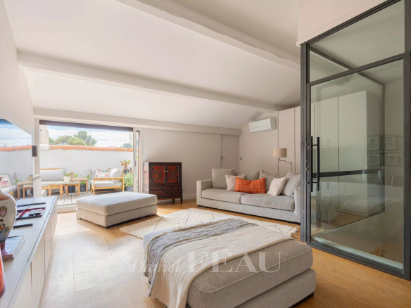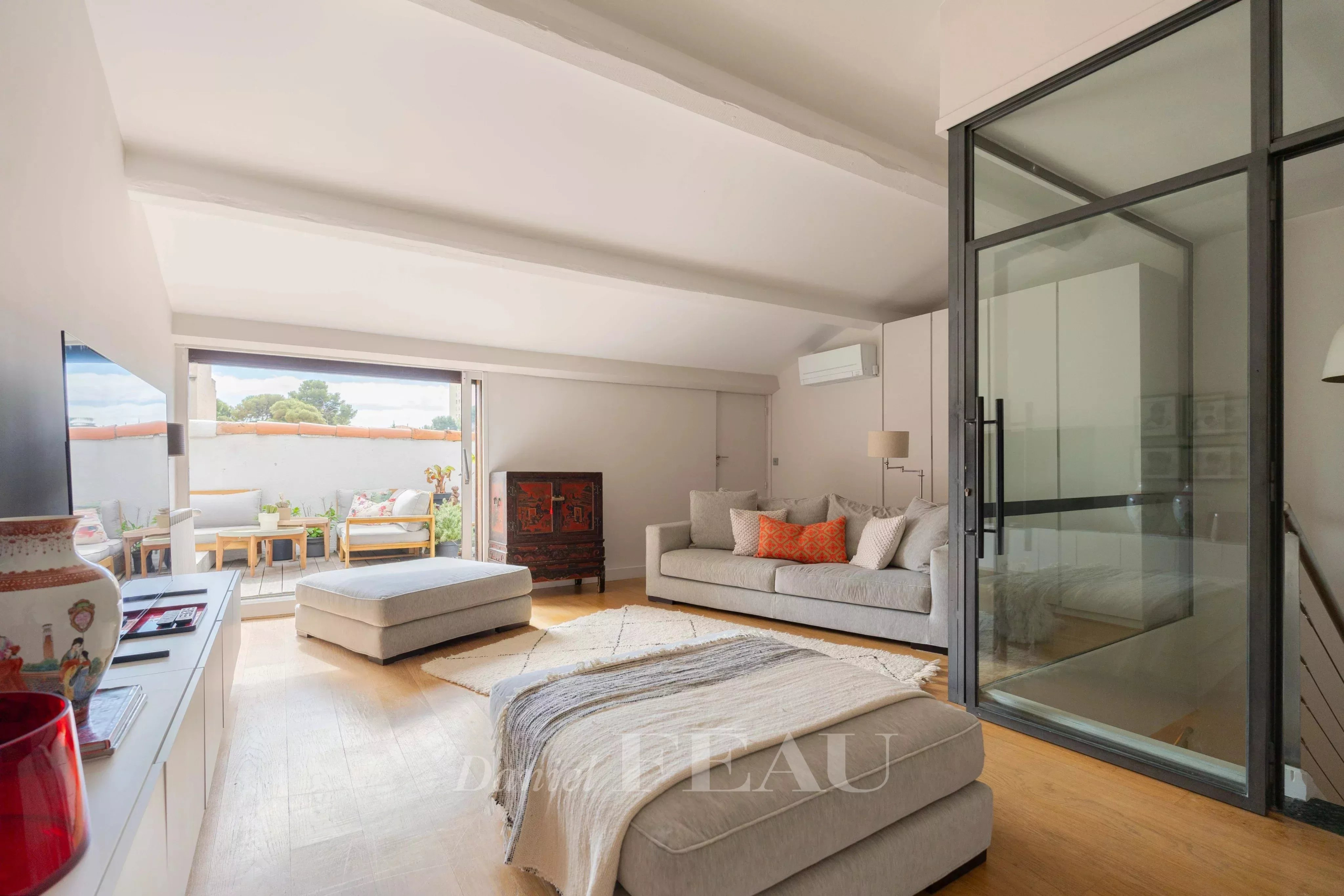 L’escalier intérieur mène à un second salon, véritable espace de détente, qui s’ouvre sur une terrasse tropézienne de 15 m² — un havre de paix pour profiter du soleil marseillais à l’abri des regards.