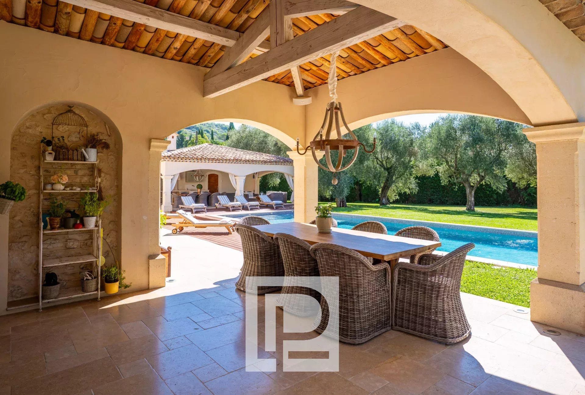 En rez-de-jardin : une suite parentale avec dressing et salle de bains, un vaste séjour avec salle à manger et une cuisine provençale chic avec îlot central, ouverte sur une large terrasse couverte.