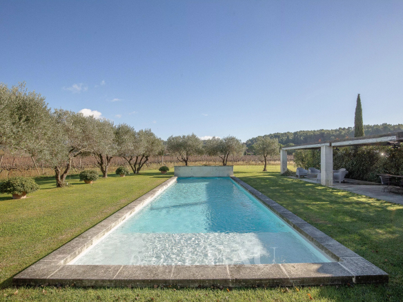 Le jardin planté d’essences méditerranéennes, accueille un terrain de pétanque, un poolhouse, une cuisine d’été, un bassin ainsi qu’une grande piscine chauffée entourée d’oliviers.