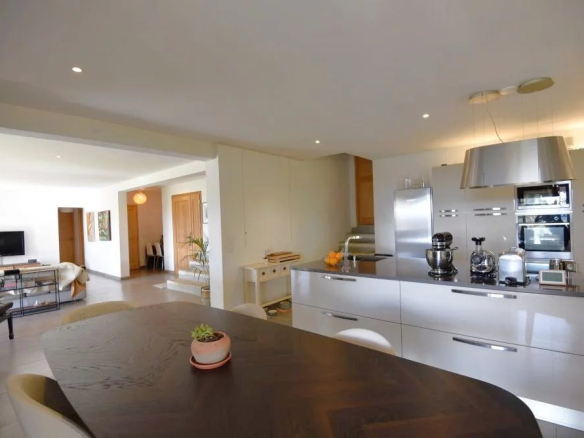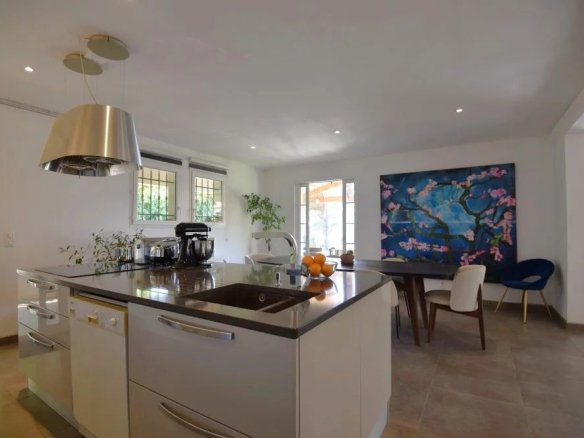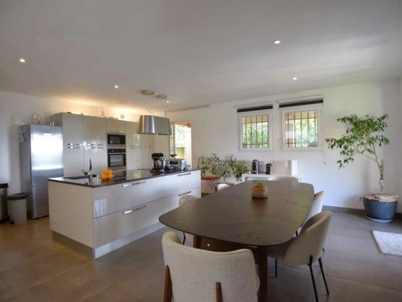 La pièce de vie spacieuse et conviviale accueille un séjour ouvert sur le jardin ainsi qu’une cuisine moderne entièrement équipée avec îlot central, parfaite pour partager des moments en famille ou entre amis.