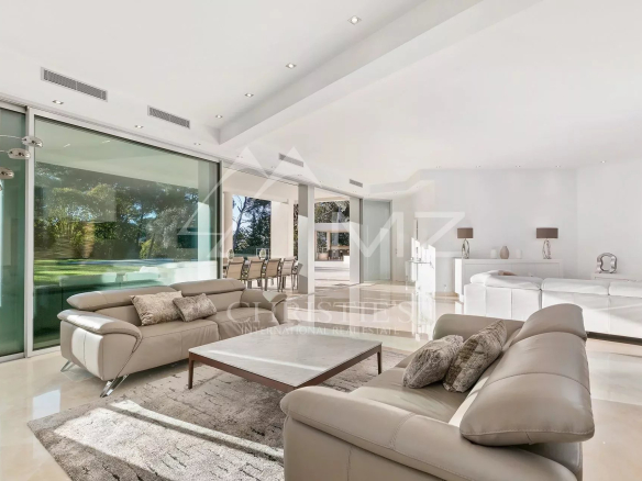 D’une superficie d’environ 625 m² la villa de style contemporain offre de généreux et lumineux volumes avec de belles pièces de réception ouvrant sur le jardin et la piscine, six chambres, dont une très belle suite de maître, avec chacune salle de bains ou douche en suite. Elle dispose également de 3 chambres indépendantes, d’une cave à vin, d’un espace sauna et d’un grand garage.