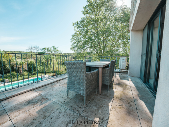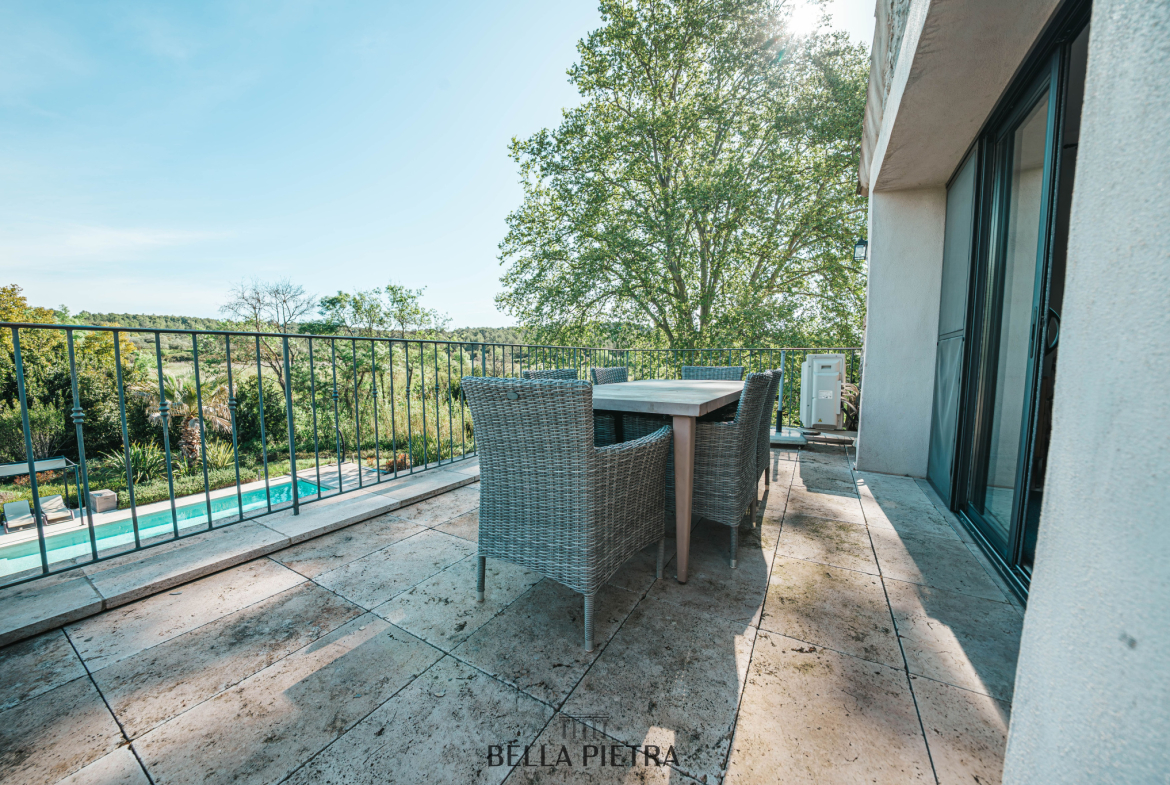 À l’étage, trois chambres avec salle d’eau privative et balcons surplombant la piscine chauffée invitent à la relaxation et à la contemplation. Le confort moderne se mêle subtilement à l’authenticité grâce au plancher chauffant/rafraîchissant, à la cheminée et aux menuiseries en aluminium.