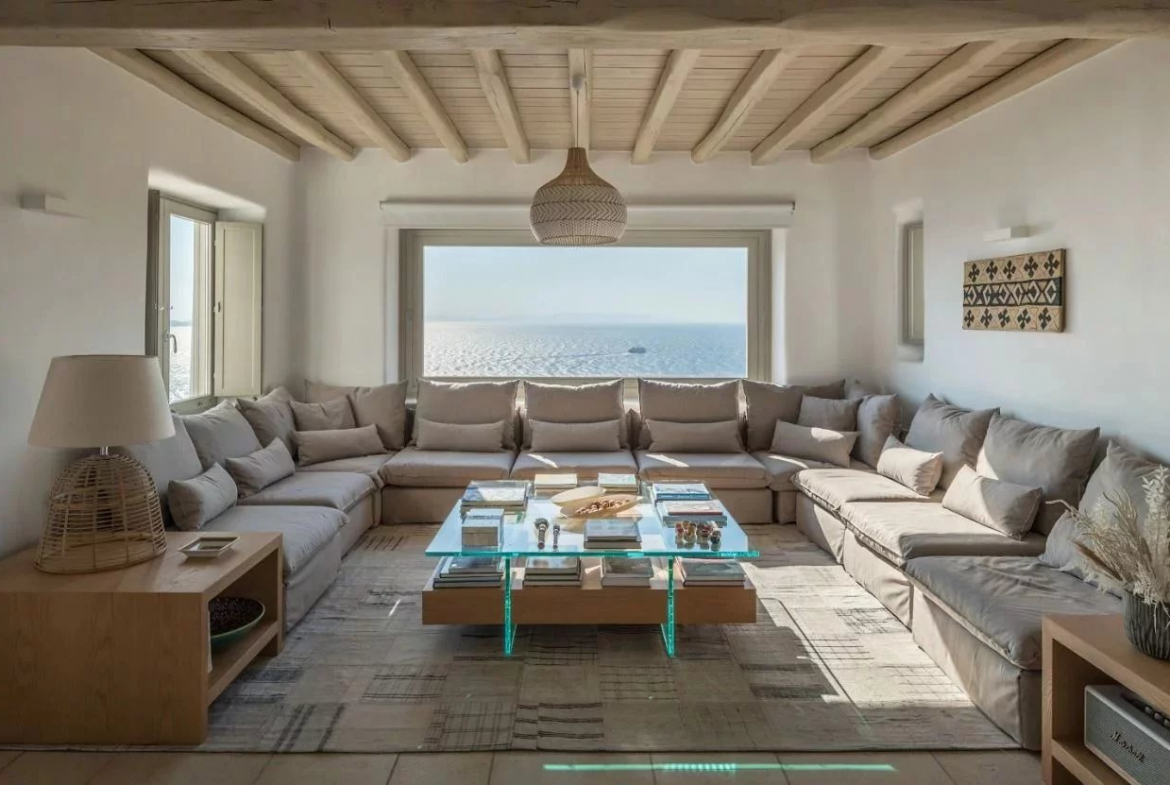 À vendre : villa de luxe à Mykonos avec vue mer 180°, piscine unique et design raffiné. Intimité et confort près des plages et attractions de l’île.