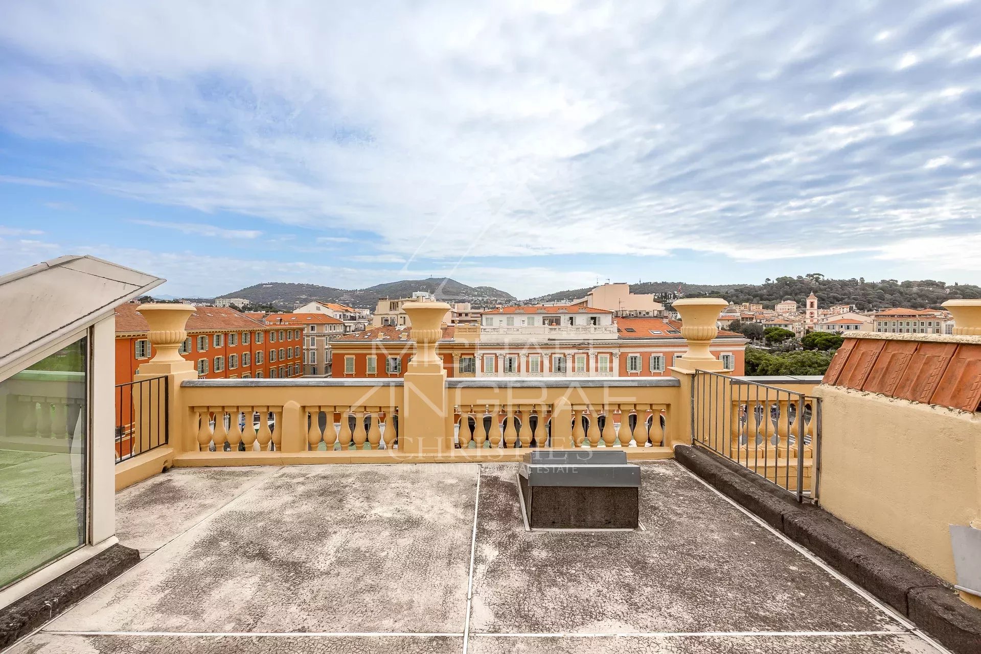 Michaël ZINGRAF Real Estate Nice vous présente au dernier étage dans une résidence classée au Titre des Monuments Historiques avec ascenseur ce magnifique appartement traversant de 188m² avec une belle terrasse de 32m² avec une magnifique vue sur Place Massena.