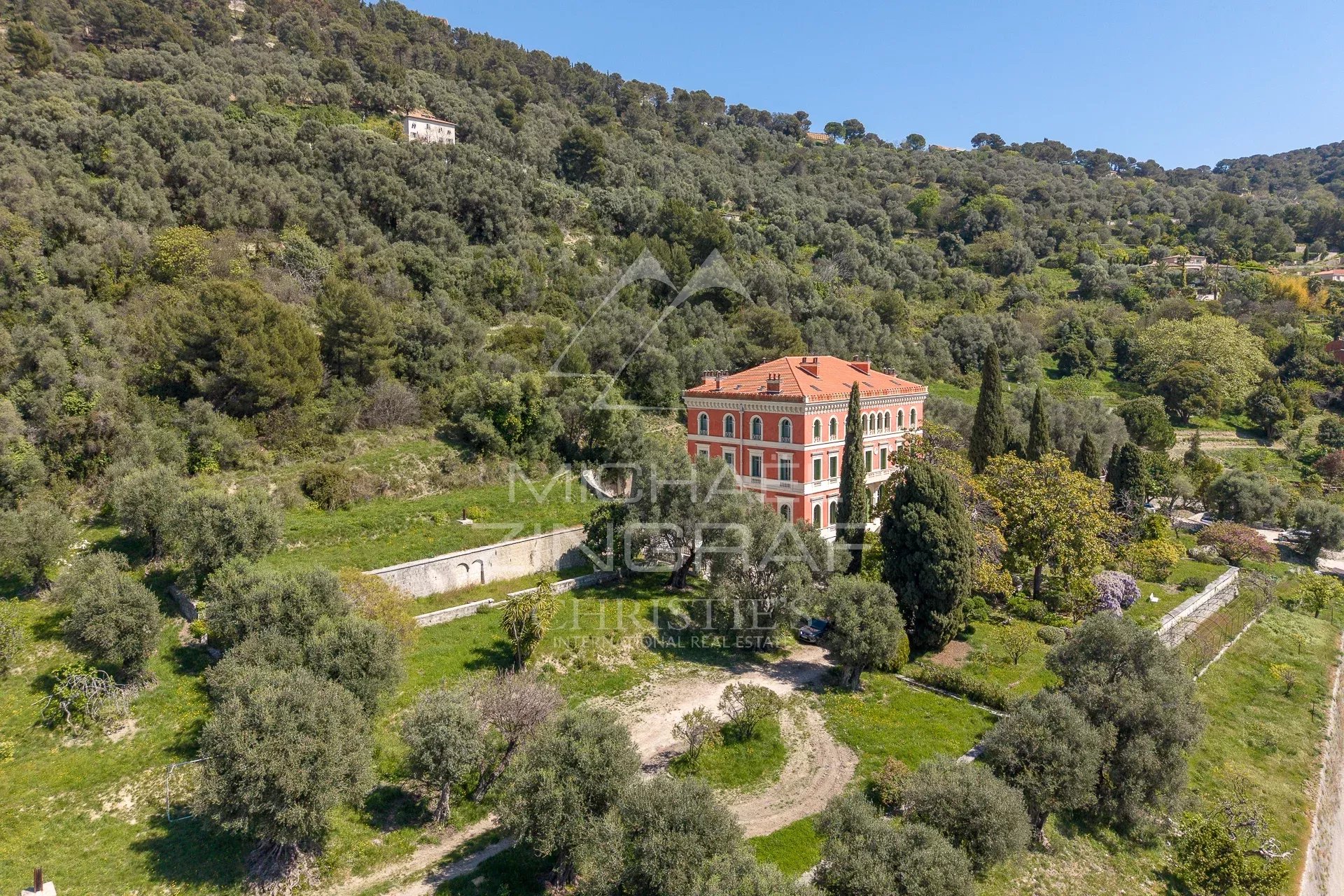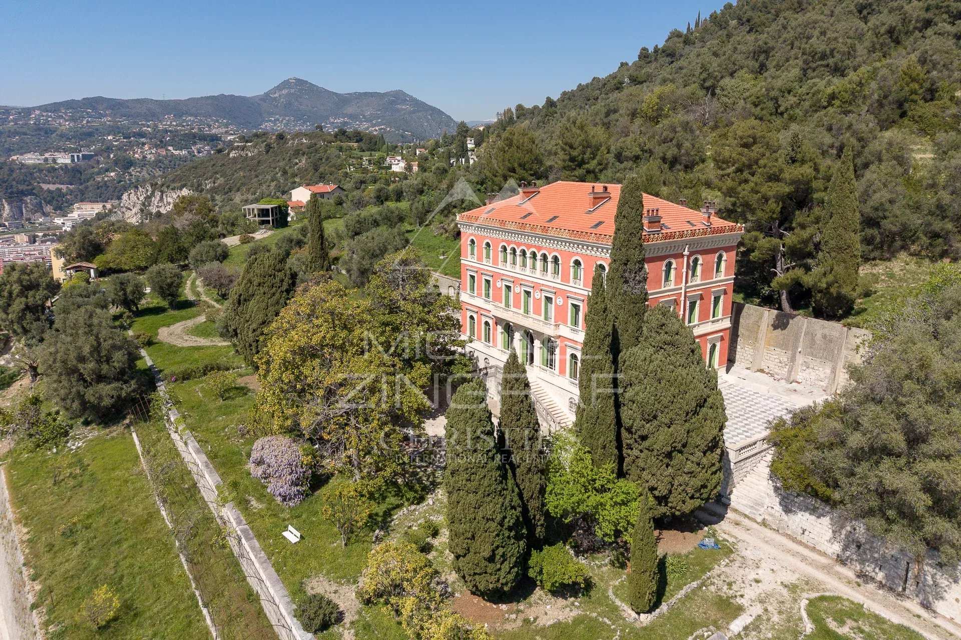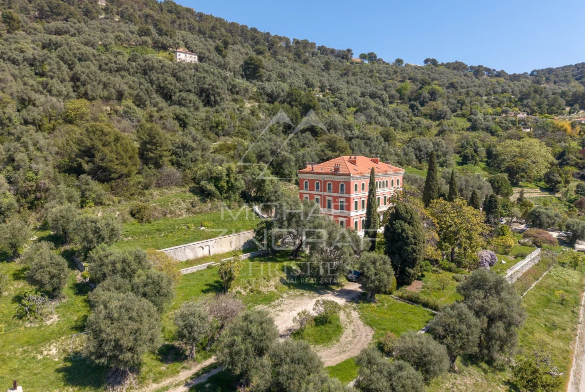 Édifiée entre 1884 et 1887 par l’architecte Vincent Levrot, la villa prend place sur les hauteurs du Mont-Gros, au cœur d’un parc d’environ 6 hectares, anciennement en restanques, aujourd’hui sublimé par de nombreux oliviers en production.