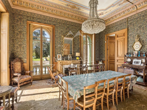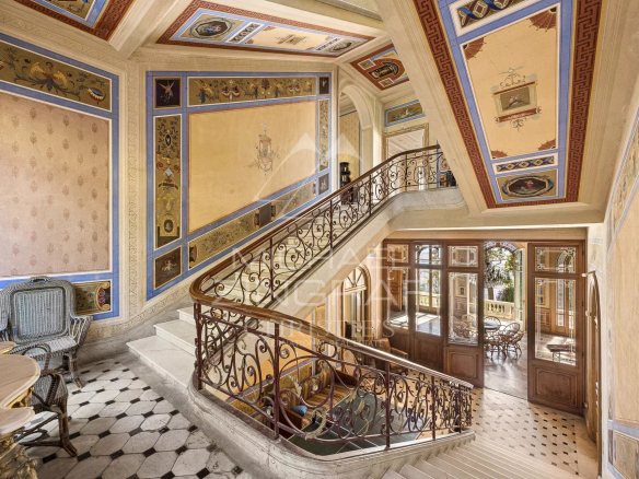Le rez-de-chaussée accueille de superbes pièces de réception : salon, salle à manger, fumoir, aux décors inspirés des grandes villas italiennes. Un escalier central distribue les étages, comprenant de nombreuses chambres, dressings et salles d’eau.