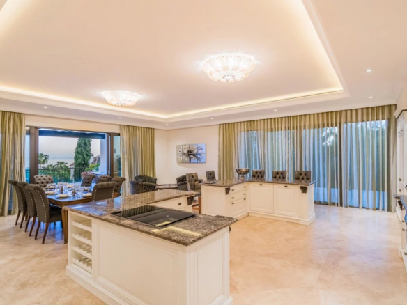 Seul le meilleur peut être attendu. La propriété bénéficie d’une palette de couleurs naturelles nobles et agréables à l’œil, d’excellents sols en marbre, de portes vitrées panoramiques et d’une cave à vin en verre, d’armoires encastrées de menuiserie de qualité, d’un dressing spacieux et pratique d’un goût et d’une qualité exceptionnels, d’un grand garage, de terrasses couvertes et ensoleillées, d’un solarium et des balcons privés parfaits pour profiter de couchers de soleil méditerranéens sensationnels, d’un verre de vin ou d’une tasse de café matinale emblématique. Imaginez : 873 m² de terrasses enveloppent votre villa de 2 720 m² !