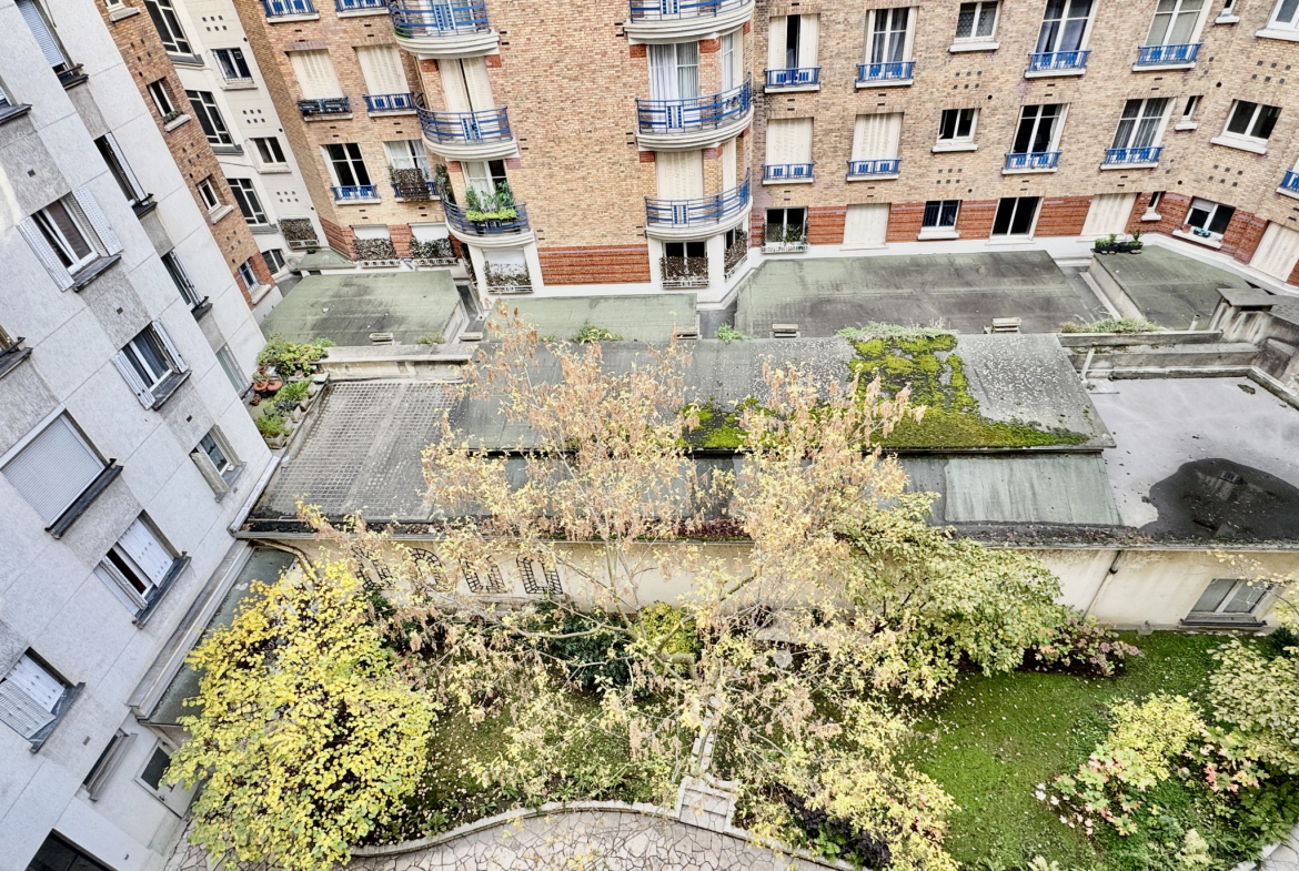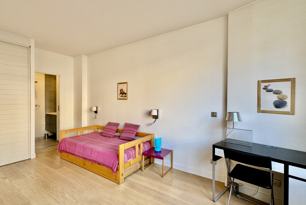 tandis qu’une seconde chambre donne sur la cour arborée et bénéficie de sa salle d’eau privative.