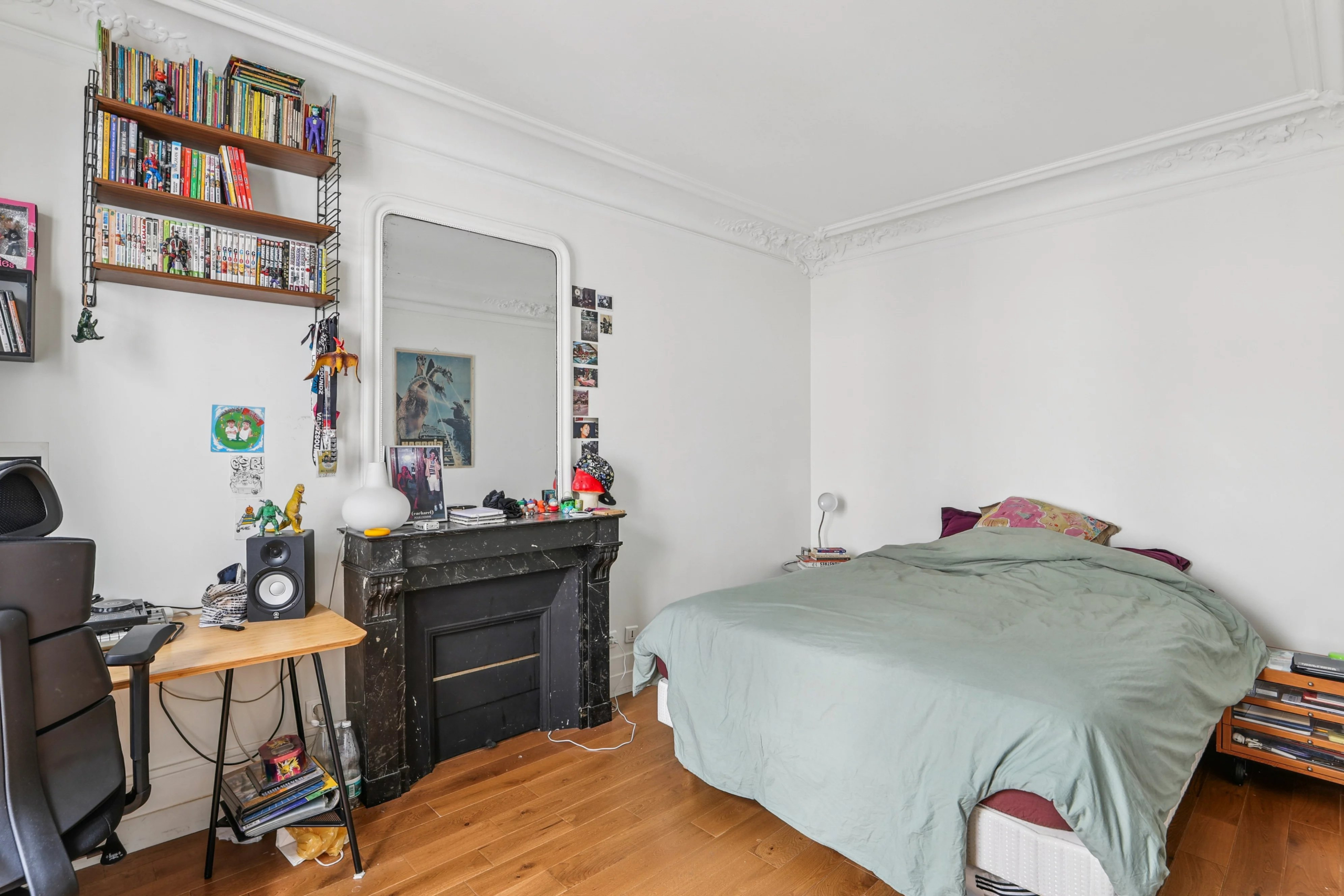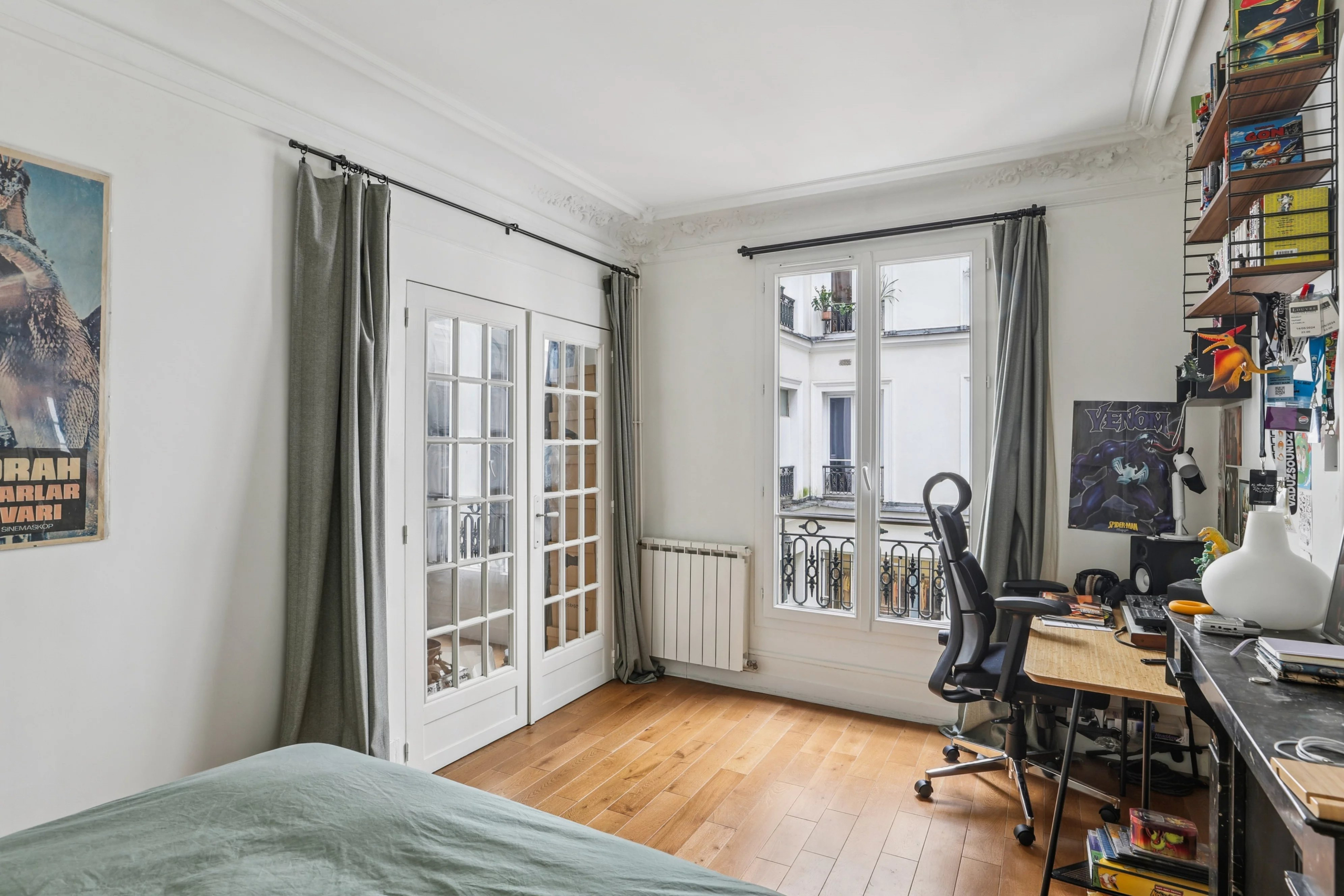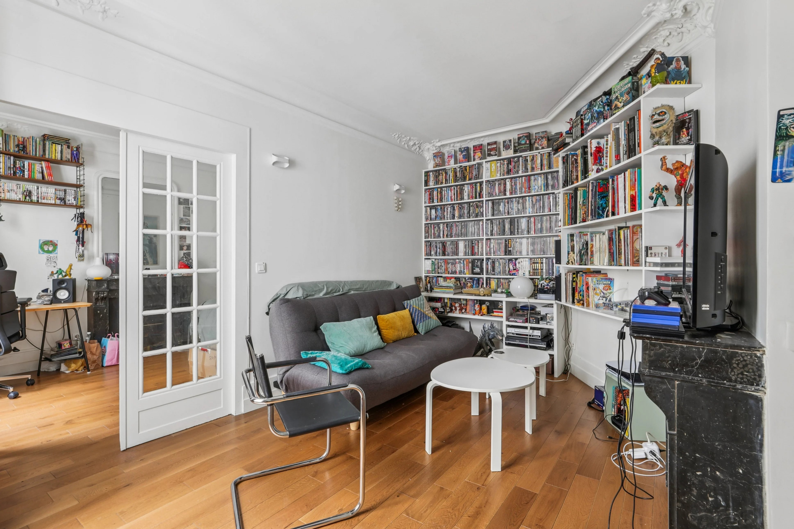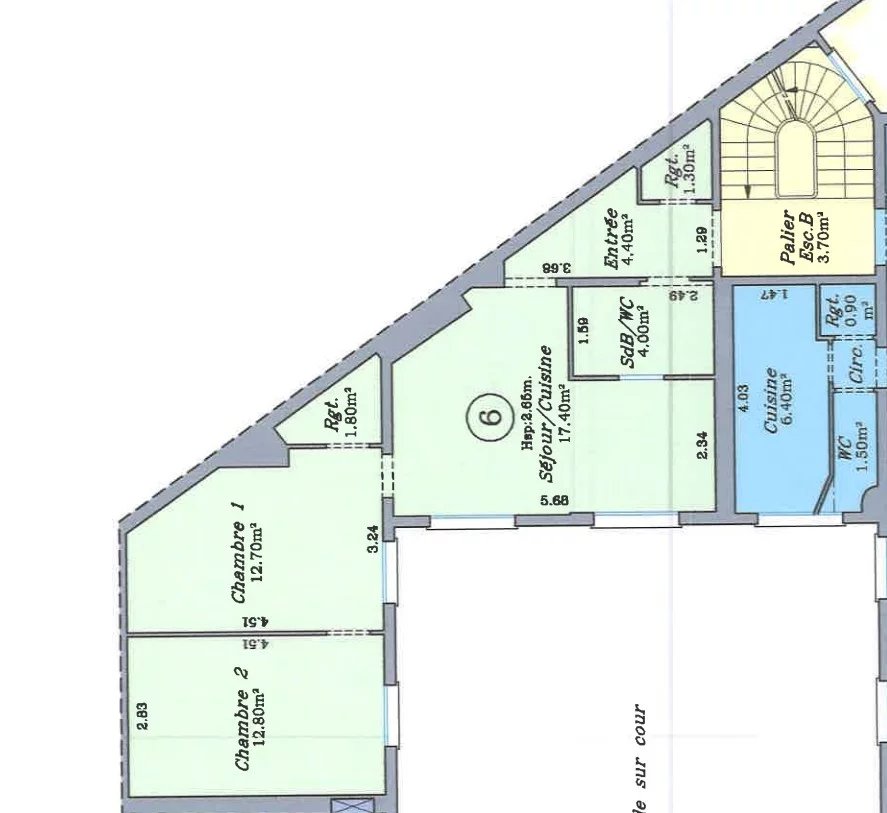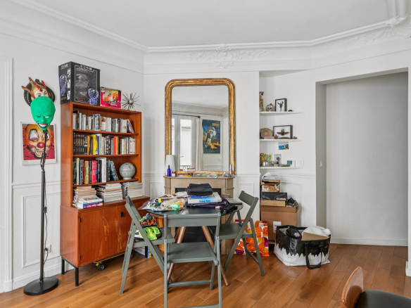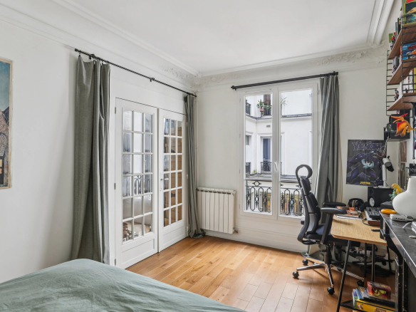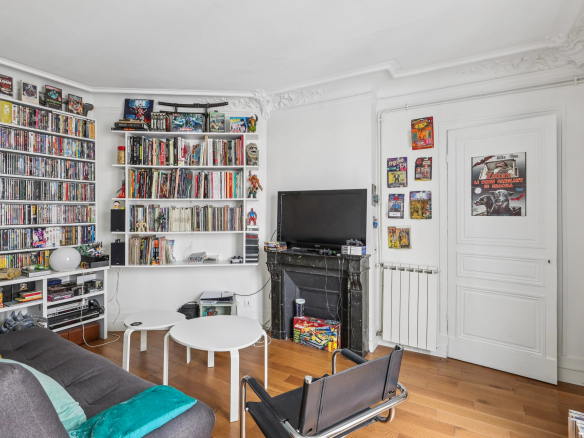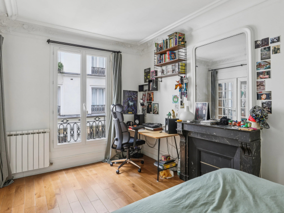 Bénéficiant du charme de l’ancien (parquet, moulures et cheminées), de beaux volumes et d’un grand calme, il se compose d’une entrée desservant un agréable séjour avec cuisine à l’américaine, deux chambres, une salle de bains avec toilettes.